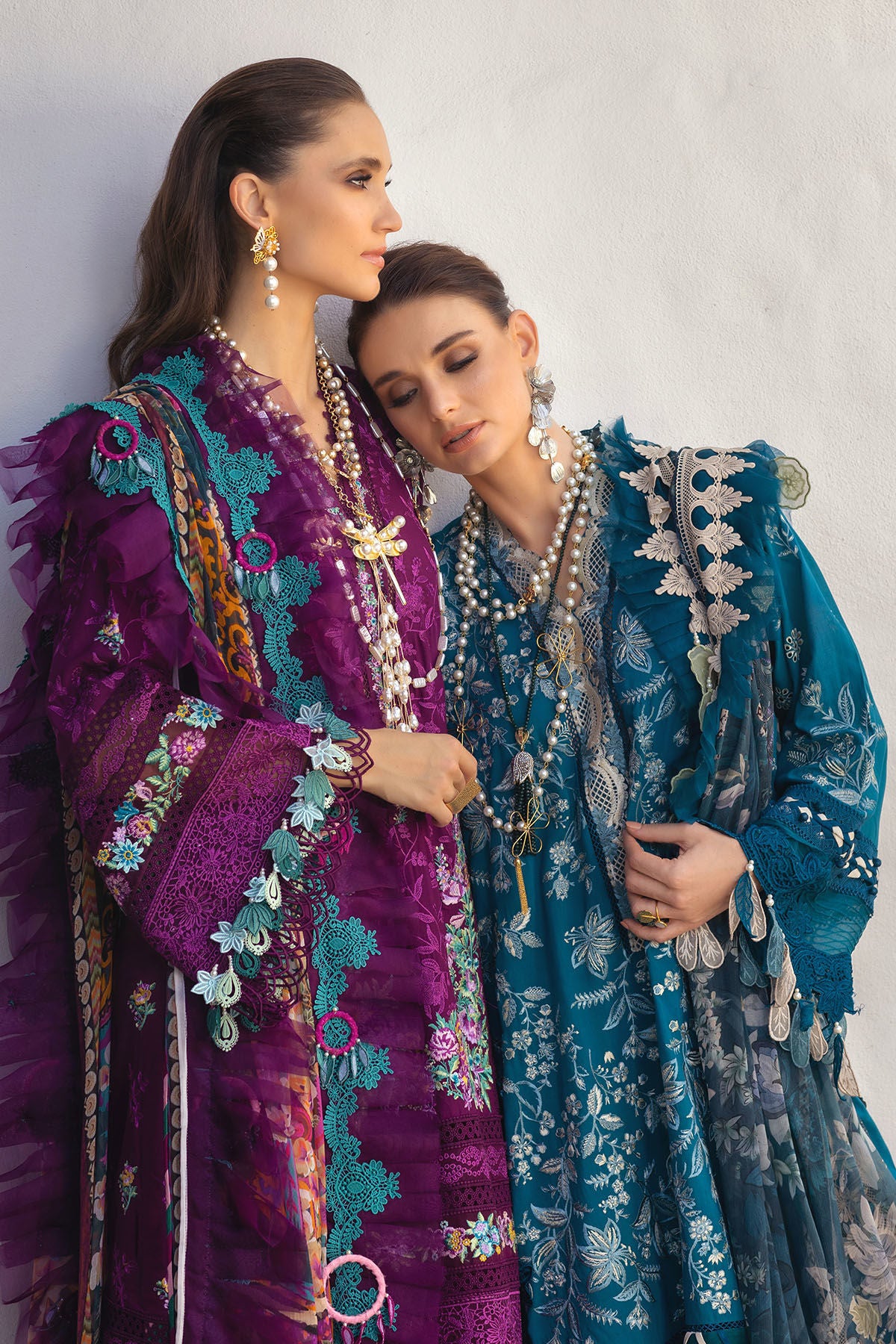 Rendered on a head turning magenta canvas, ‘Zoila’ features miniature floral bouquets on centre front and side panels. The centre front is further accentuated with tonal embroidered details in floral manner. The hemline and sleeves of the shirt are adorned with floral and self-embroidered details on sheer organza. The lawn shirt is accompanied by breathable bottoms and a head turning chiffon dupatta featuring an array of floral and geometric patterns in a resplendent color scheme.