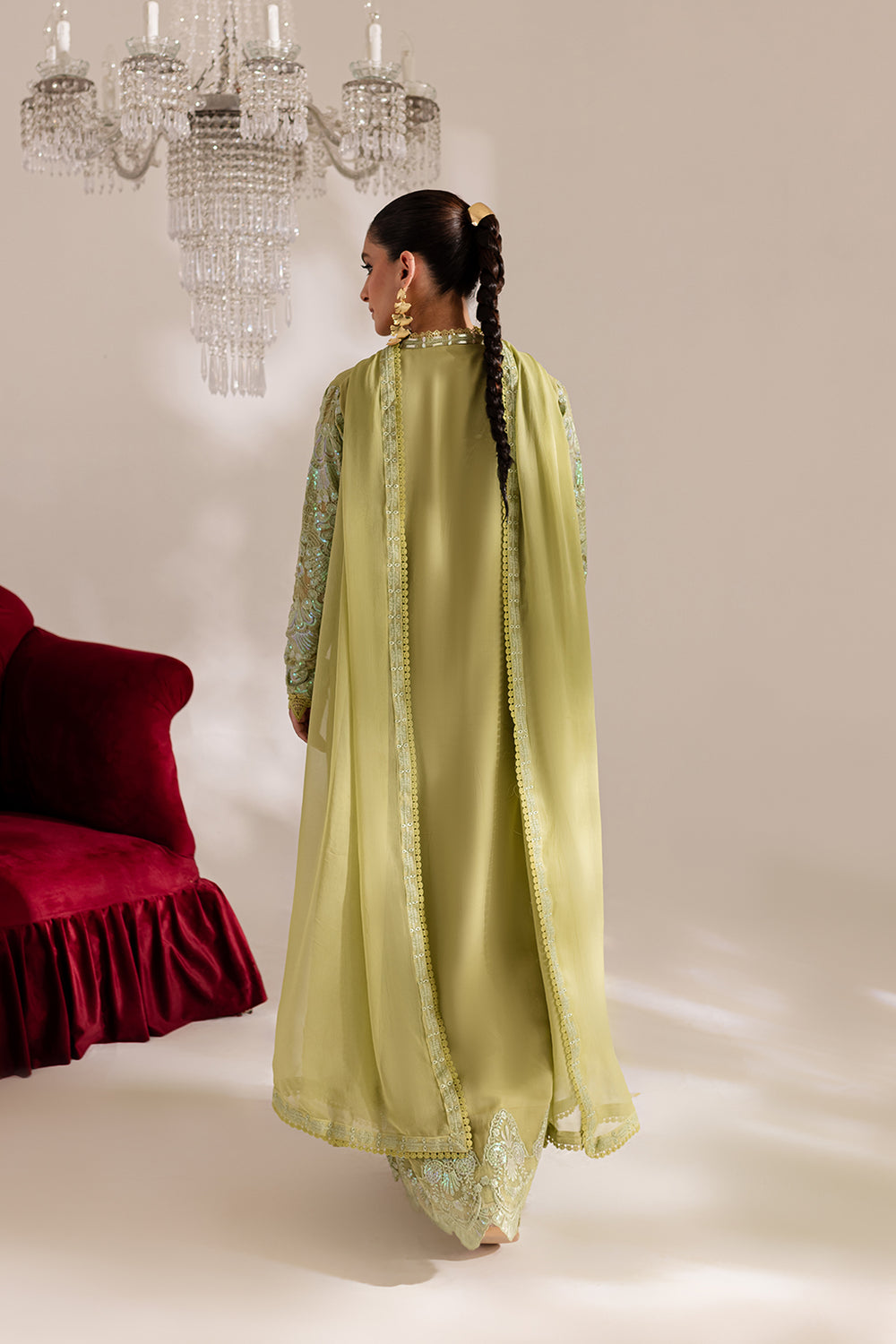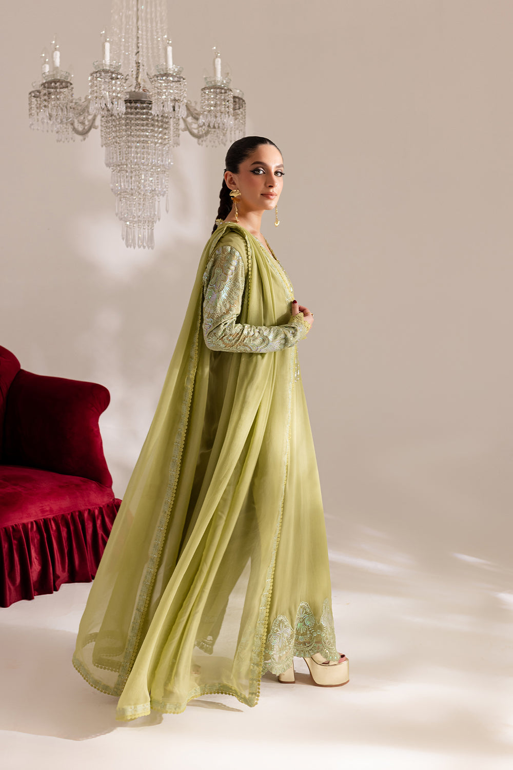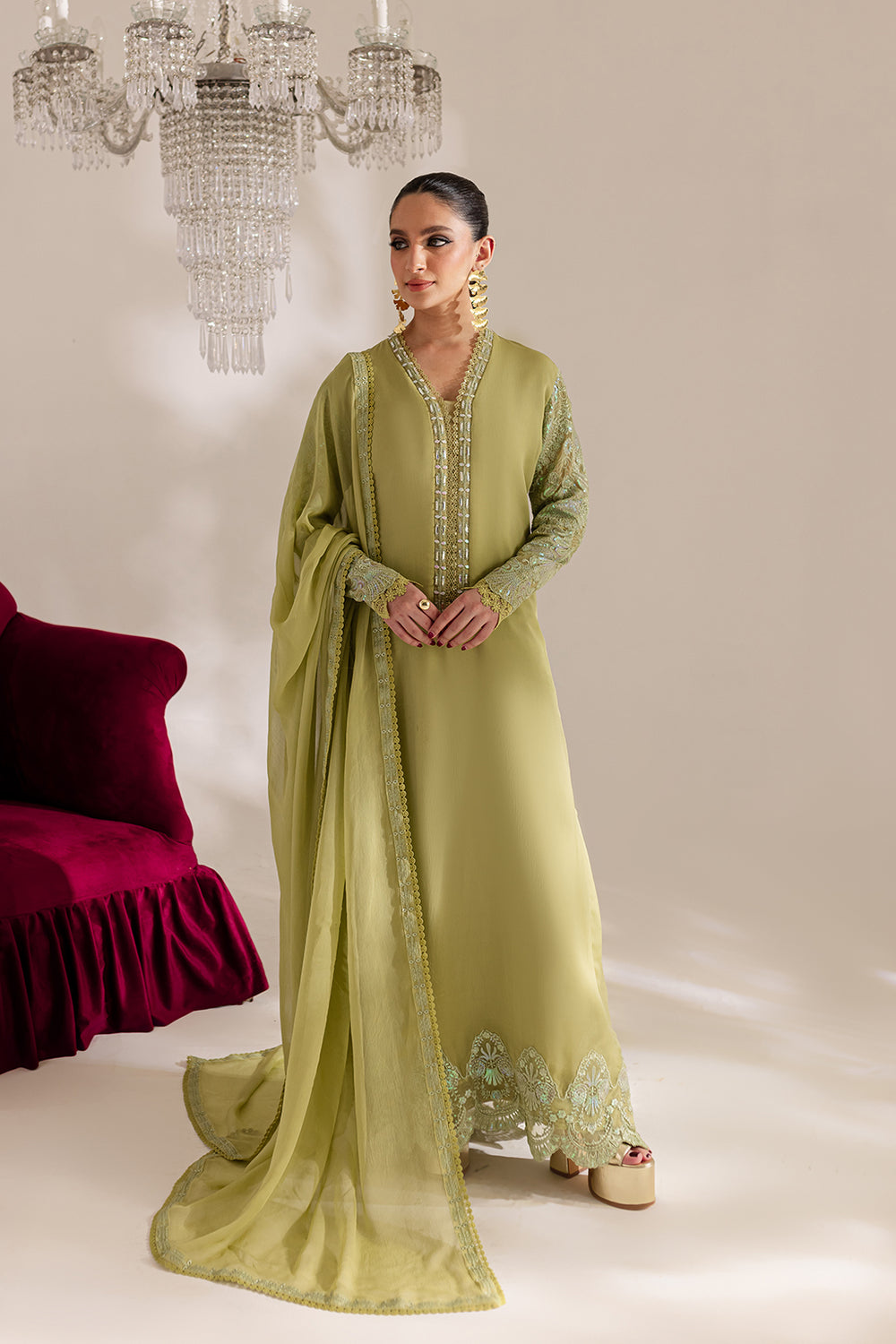 Mint chiffon embroidered long shirt, paired with raw silk straight trouser and embroidered chiffon dupatta.