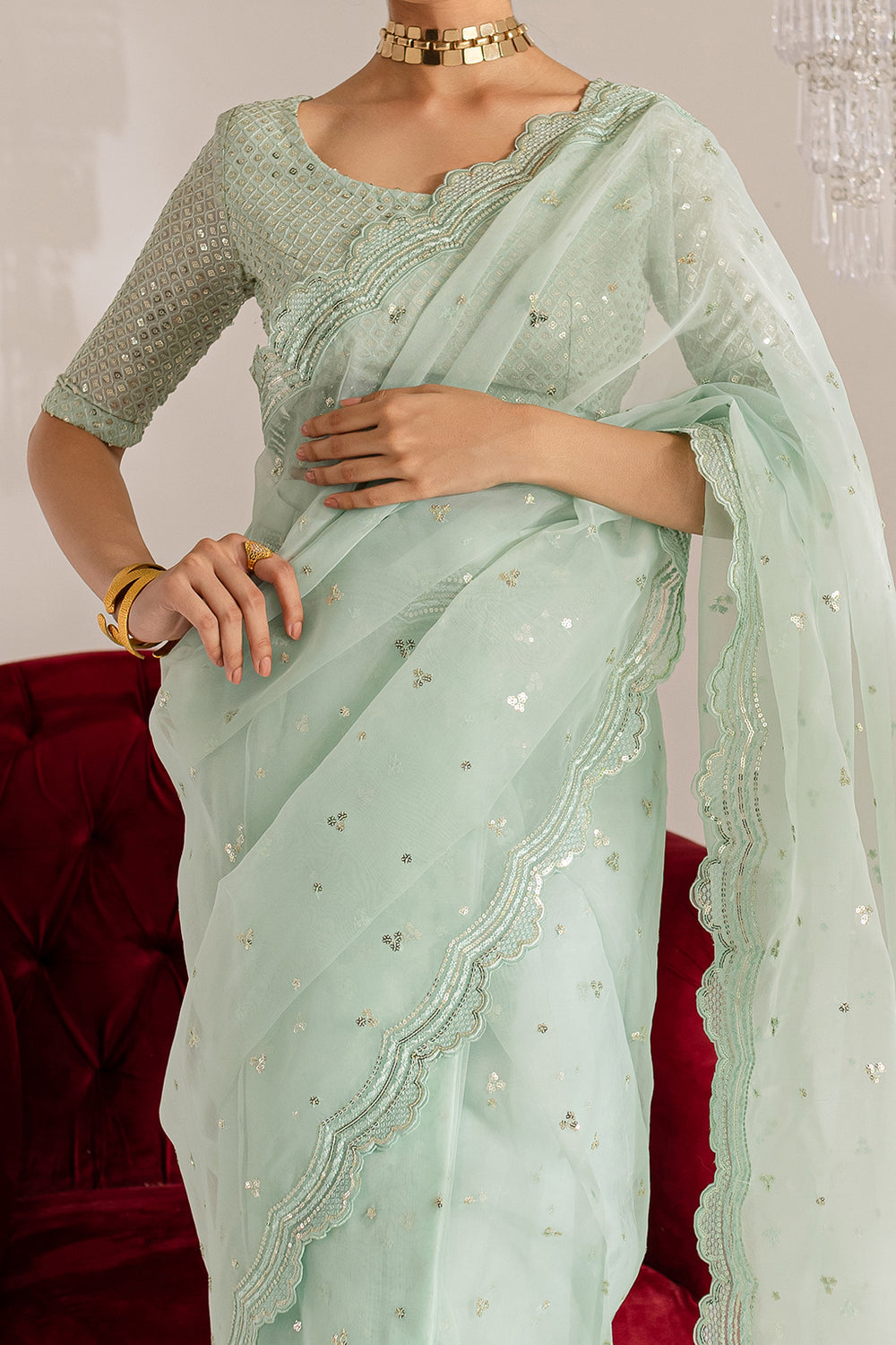 Mint embroidered organza sari, paired with embroidered chiffon blouse with hand made tassel attachment.
