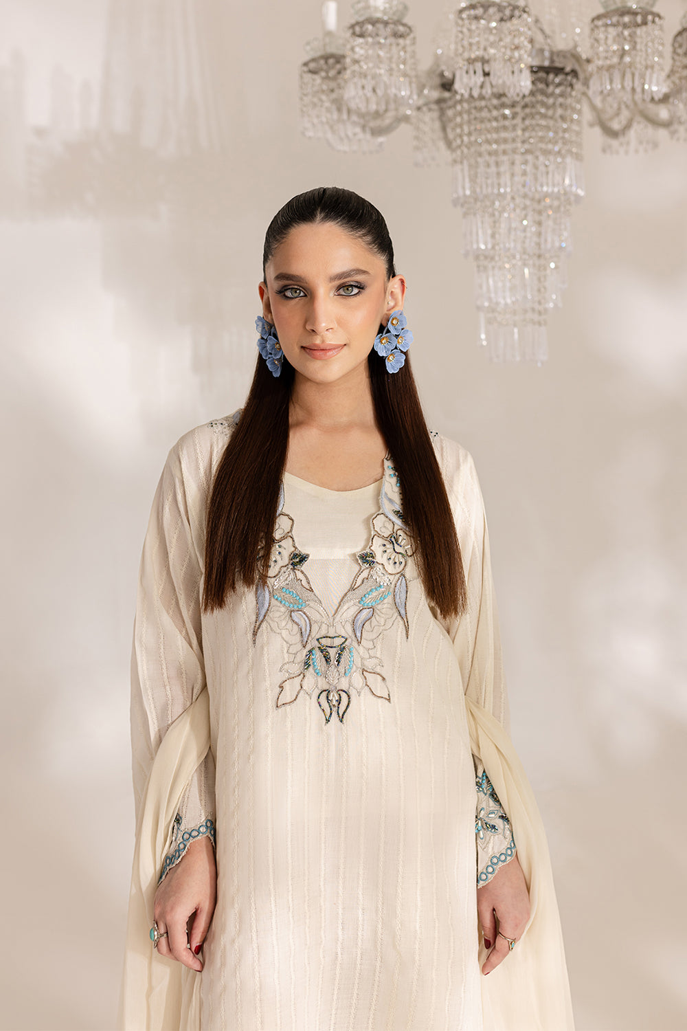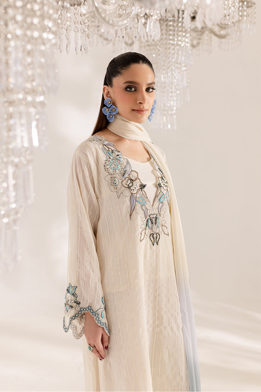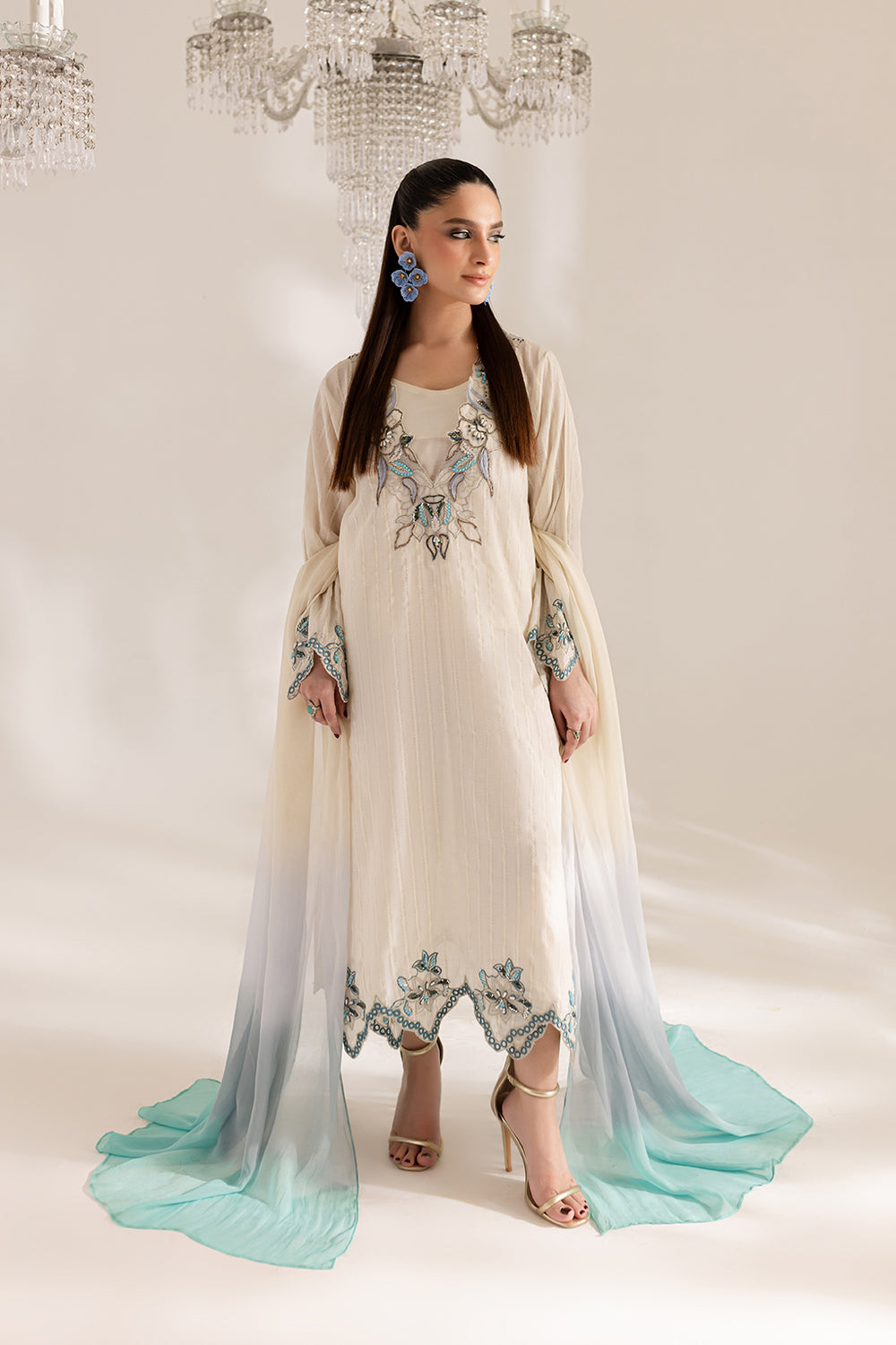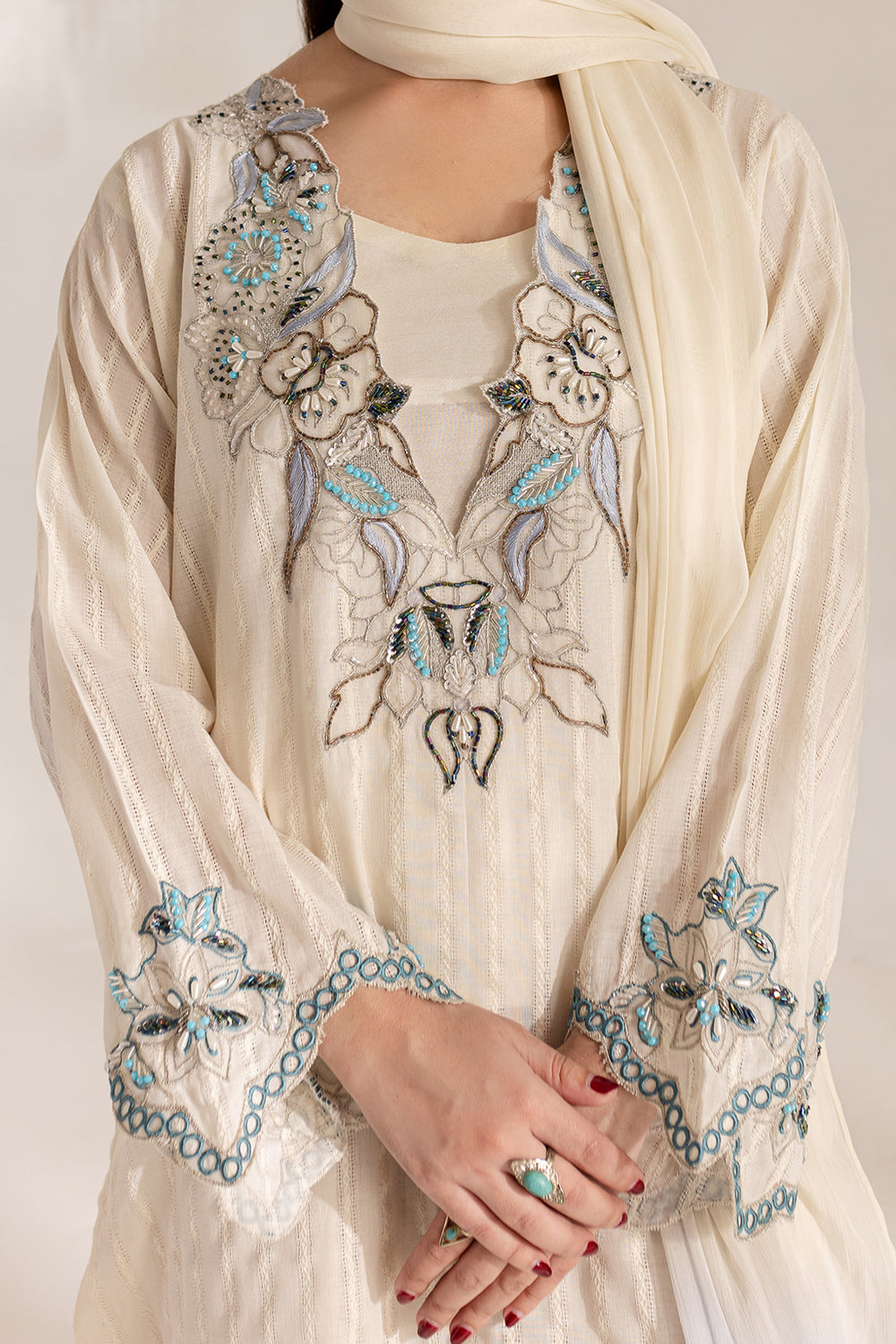 Off white cotton jacquard shirt with delicate hand work and embroidery details, paired with tie & dye dupatta, straight trouser & separate inner.