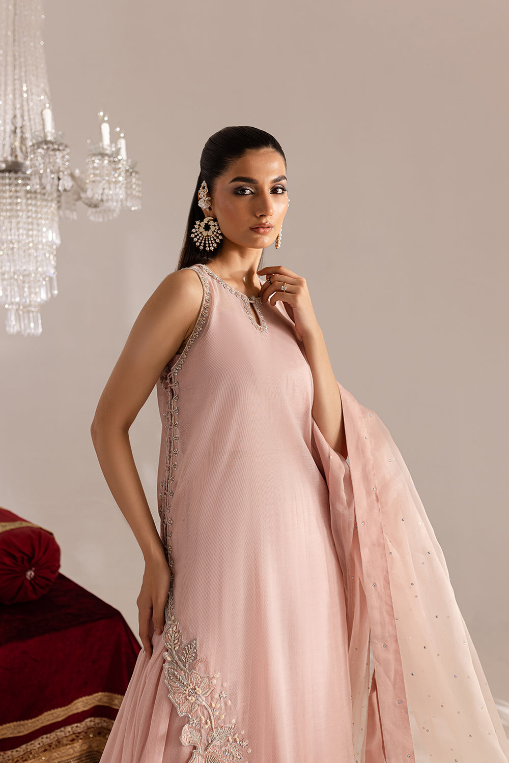Powder pink Masoori shirt with delicate hand work & embroidery details, paired with chiffon shrara and embroidered organza dupatta. (Sleeves will be sent with the article)
