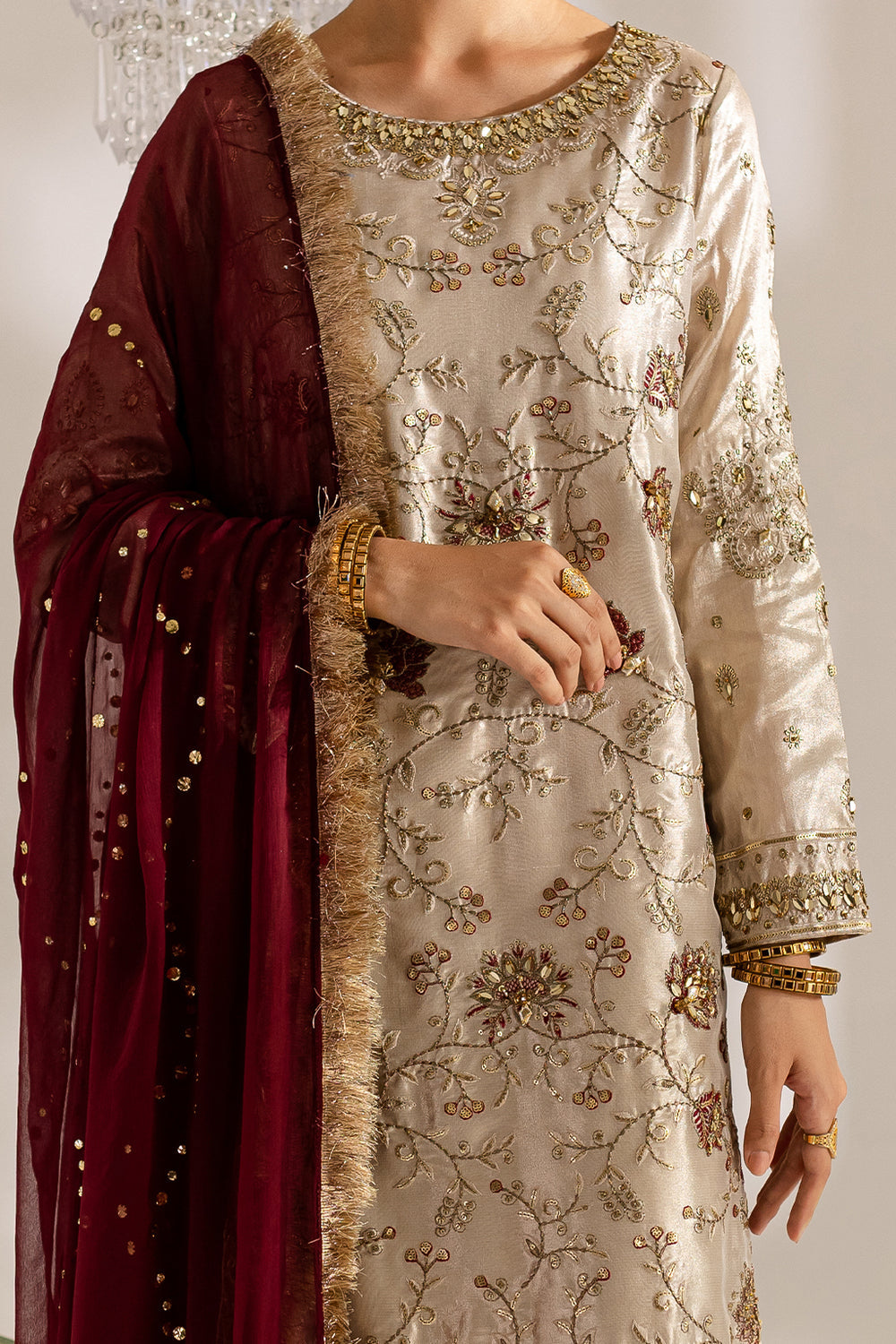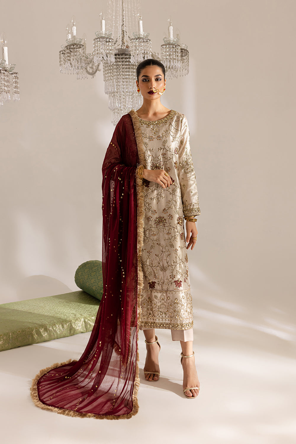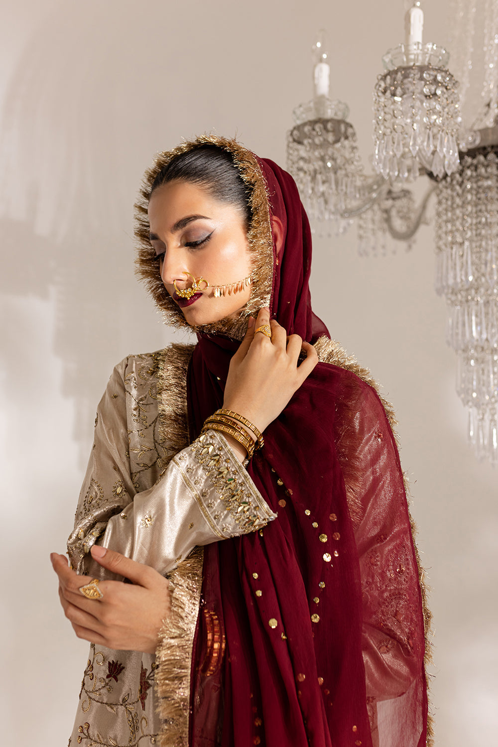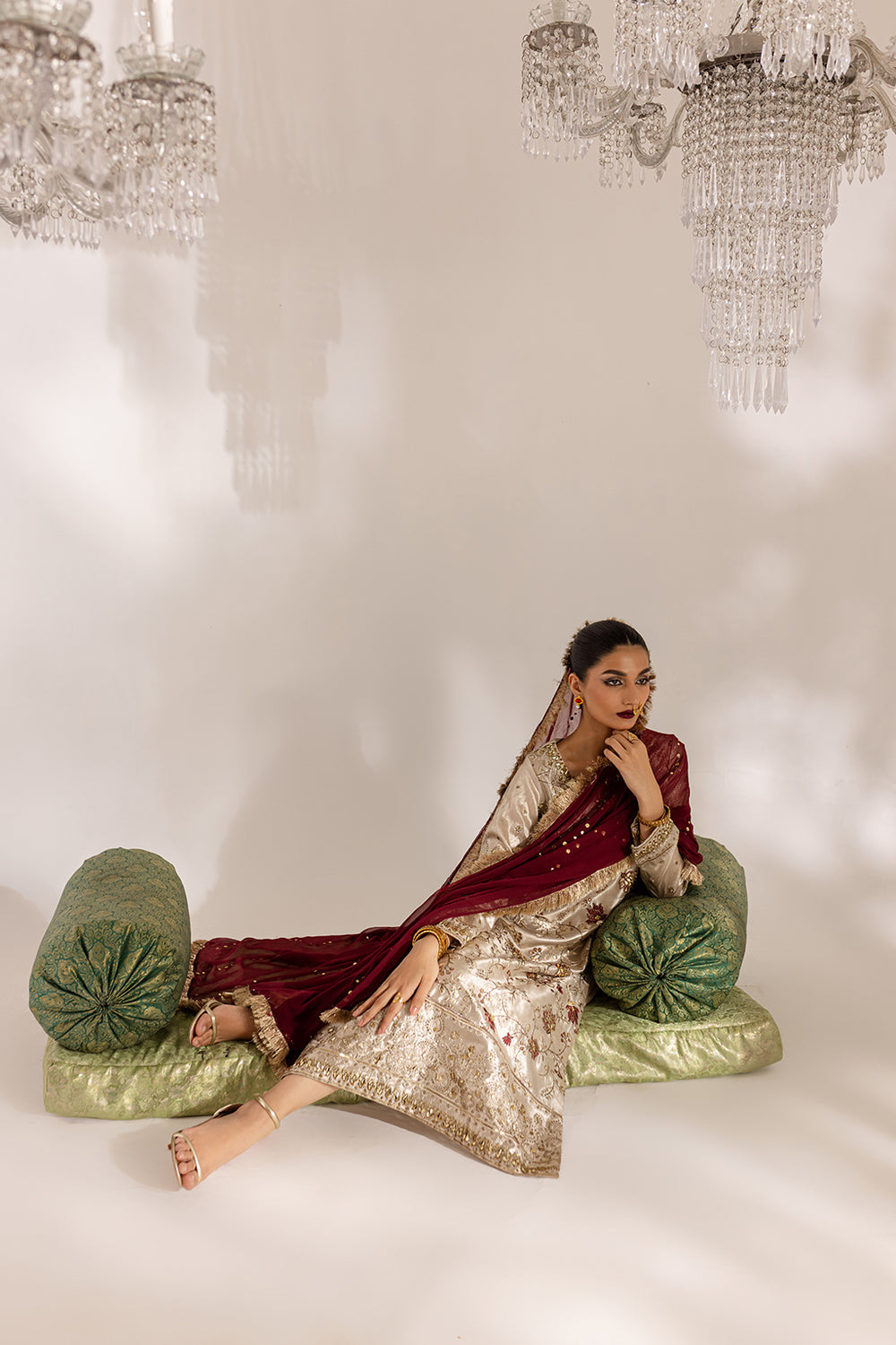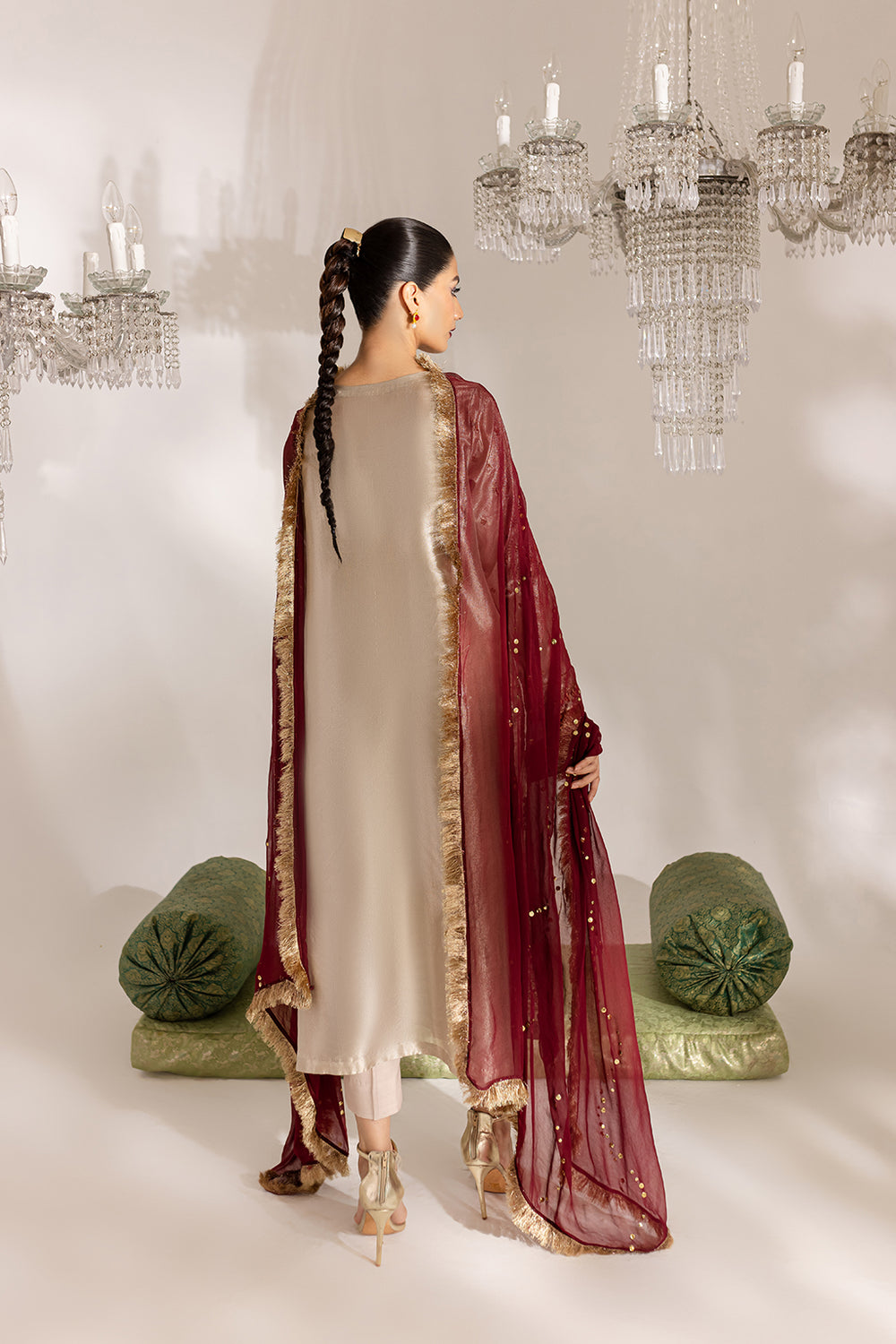 Masoori fabric long shirt with delicate hand work & embroidery details, paired with raw silk trouser & chiffon dupatta with mukaish work.