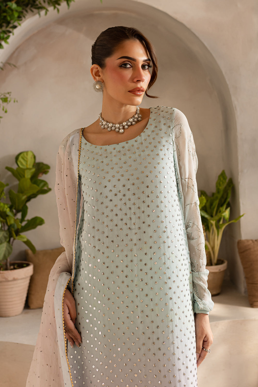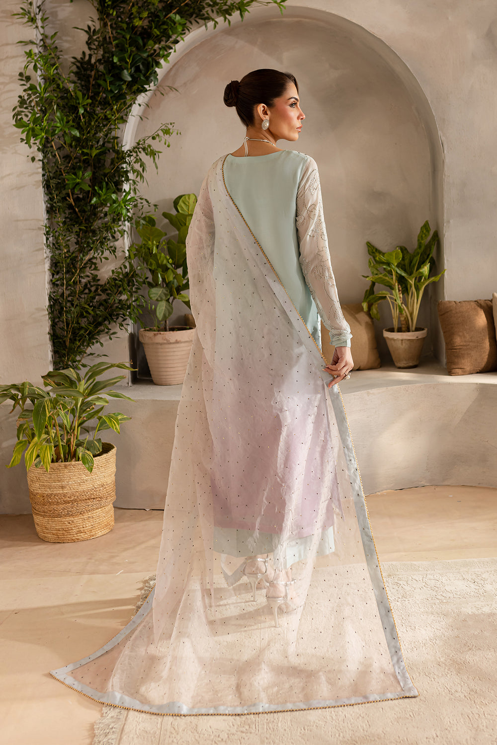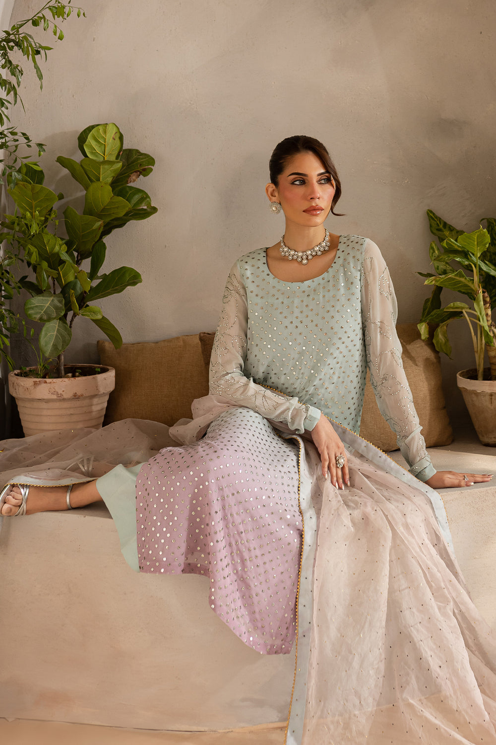Powder blue and lilac two tone chiffon shirt with delicate mukaish work paired with raw silk trouser and mukaish work organza dupatta.