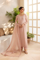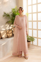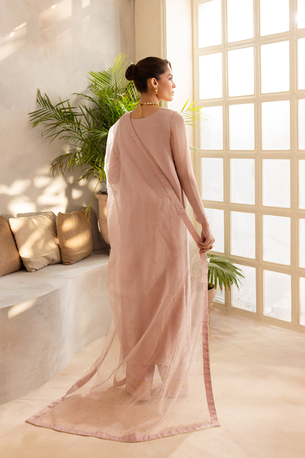Powder pink chiffon shirt with delicate mukaish work paired with raw silk plazo and mukaish work organza dupatta.
