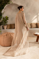 Beige chiffon shirt with delicate mukaish work paired with raw silk trouser and mukaish work organza dupatta.
