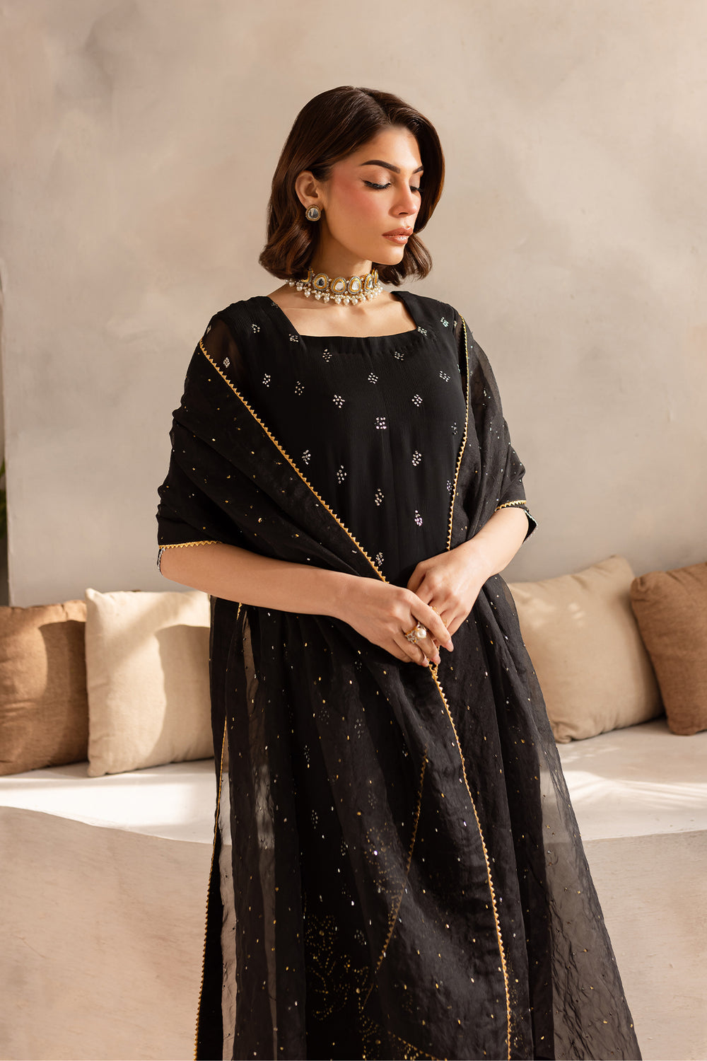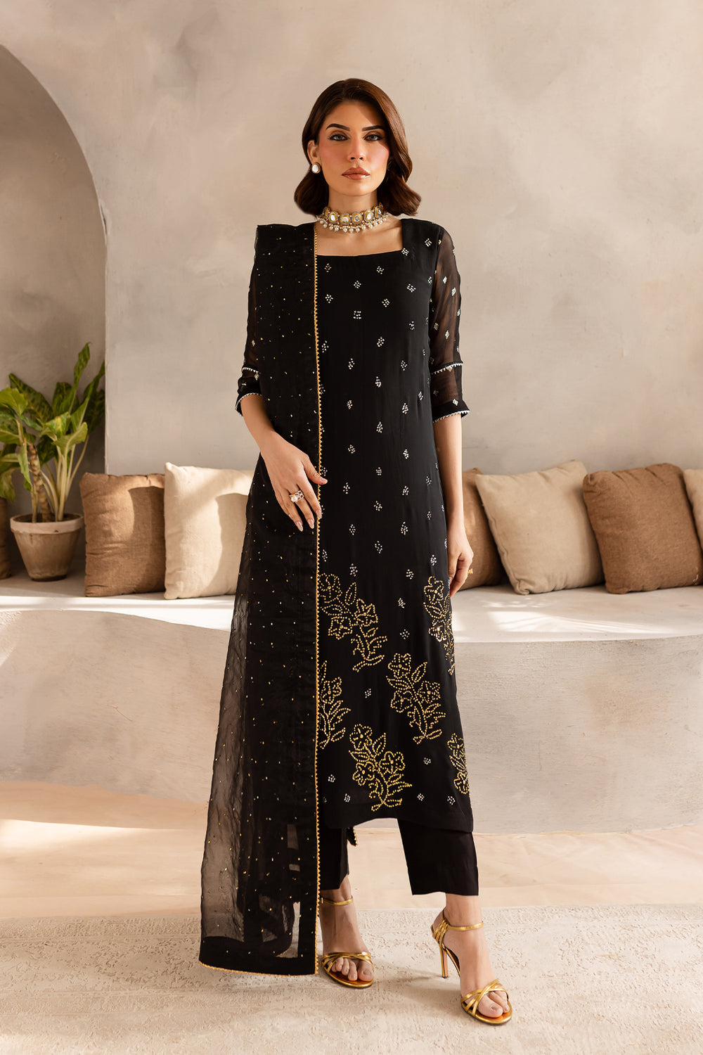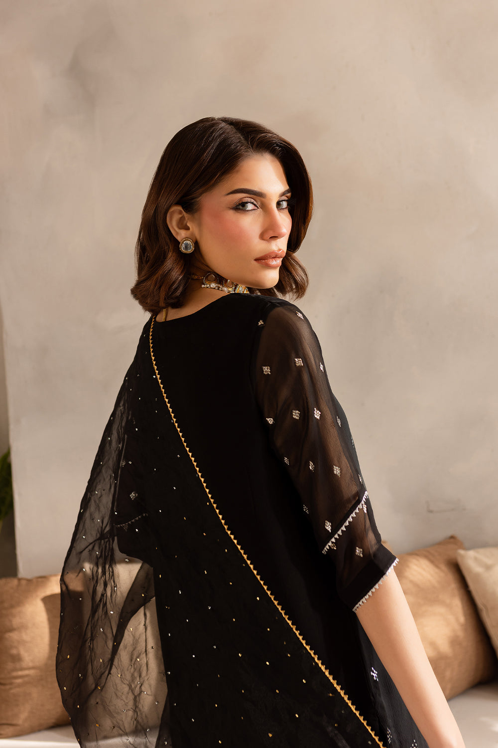 Black chiffon shirt with delicate mukaish work paired with raw silk trouser and mukaish work organza dupatta.