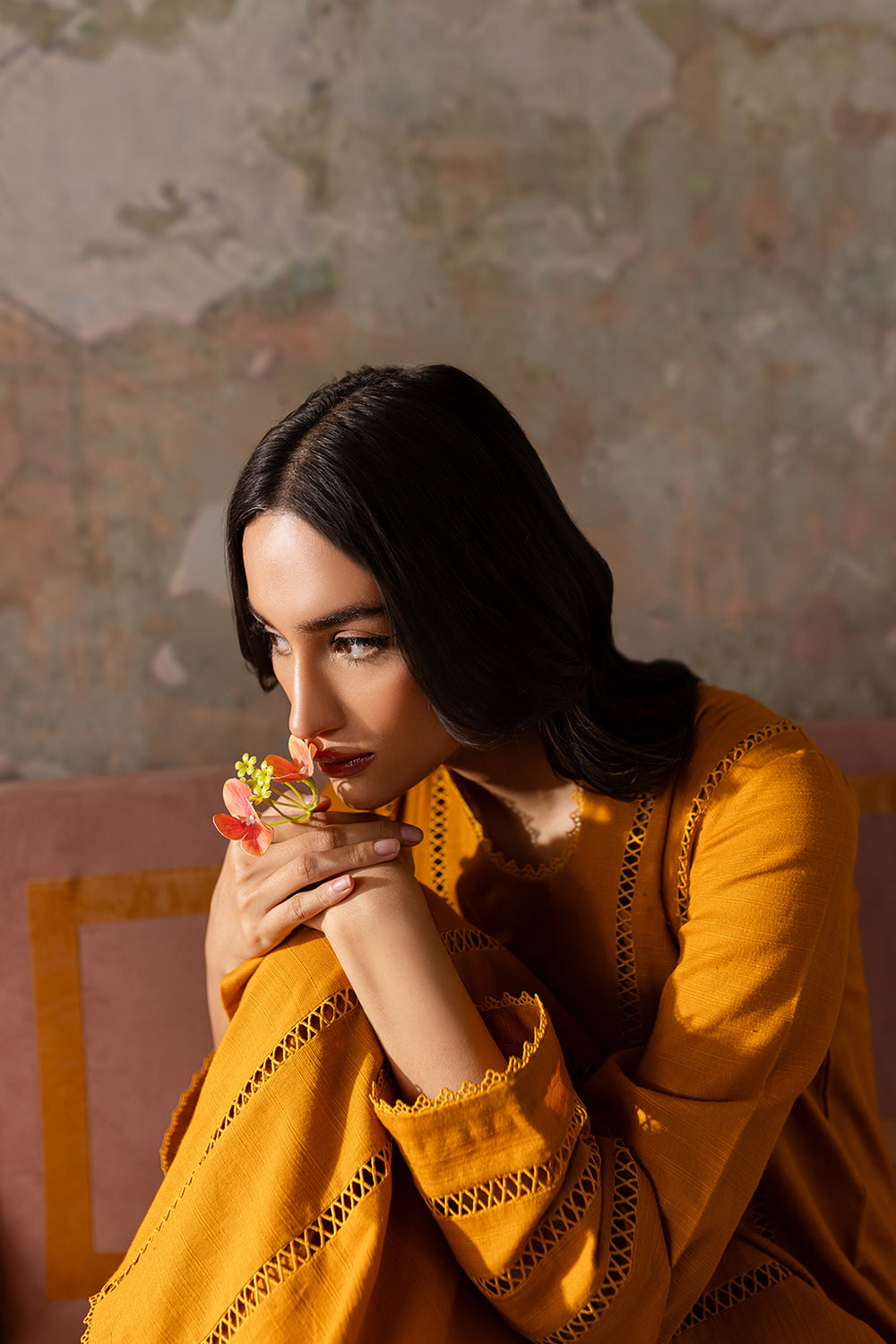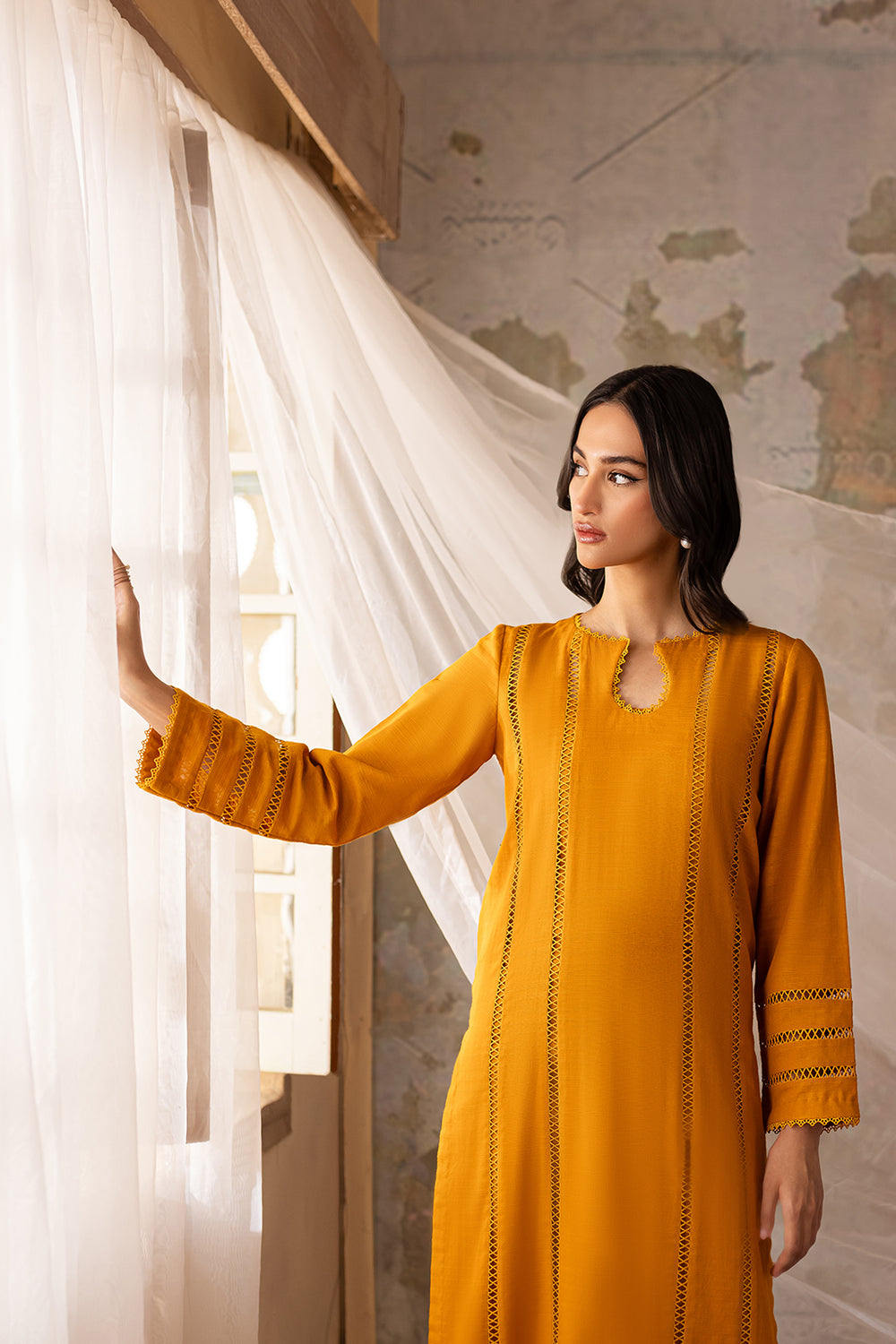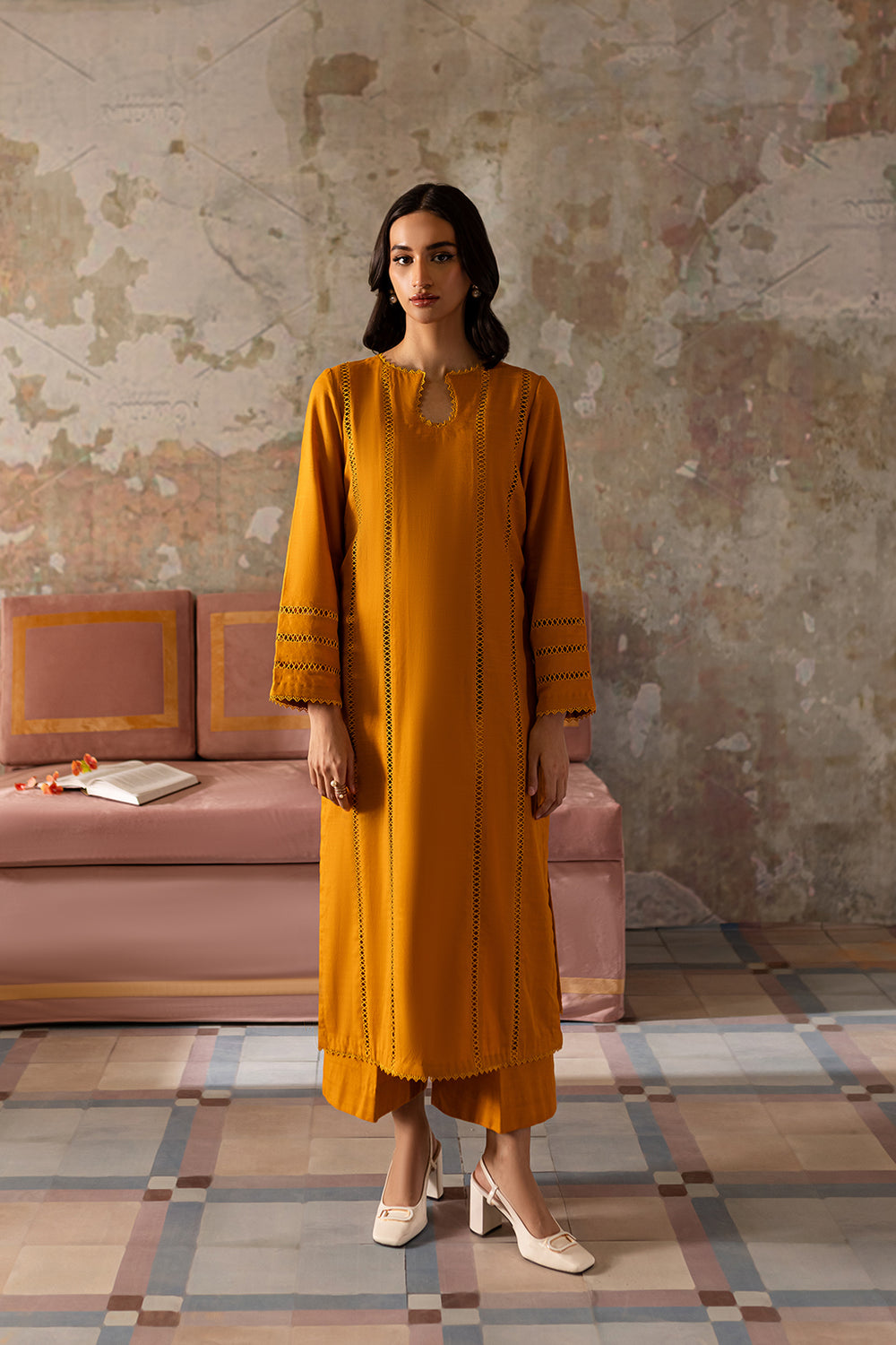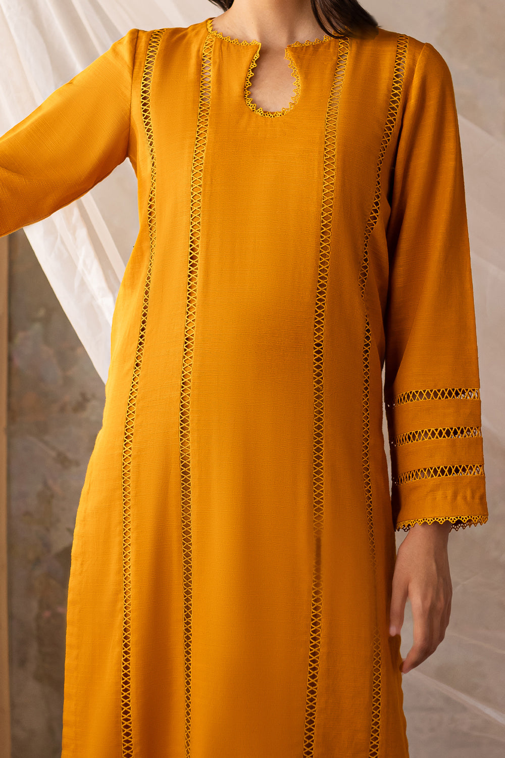 Mustard shirt with lace detailing on front & sleeves, paired with wide legged trousers