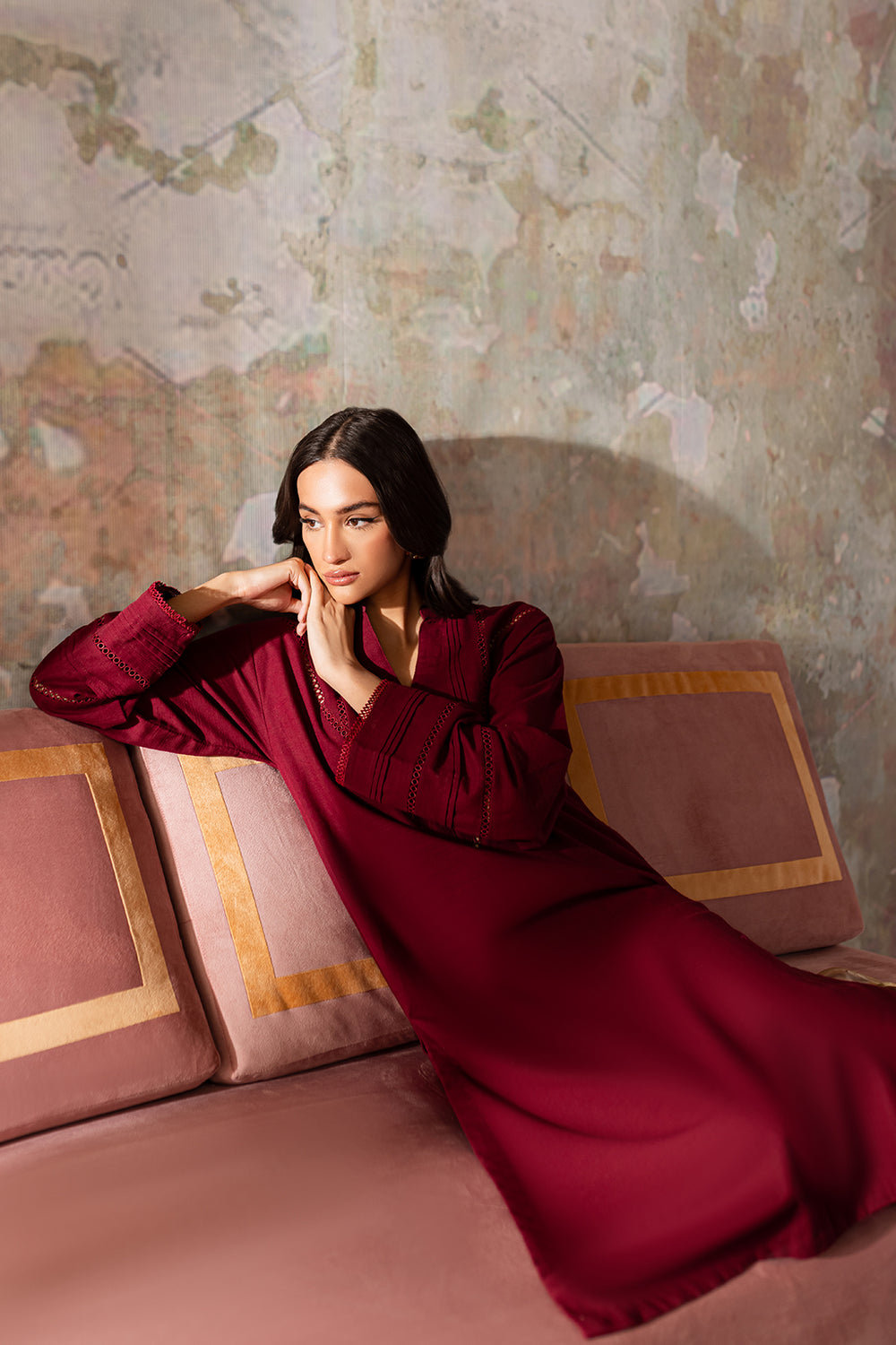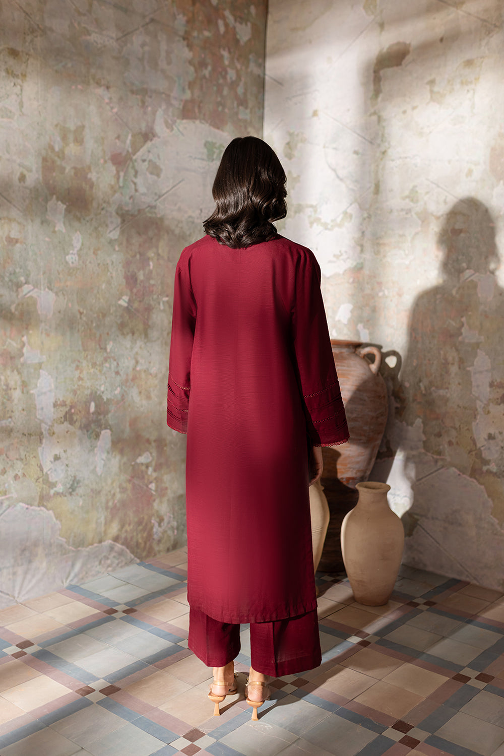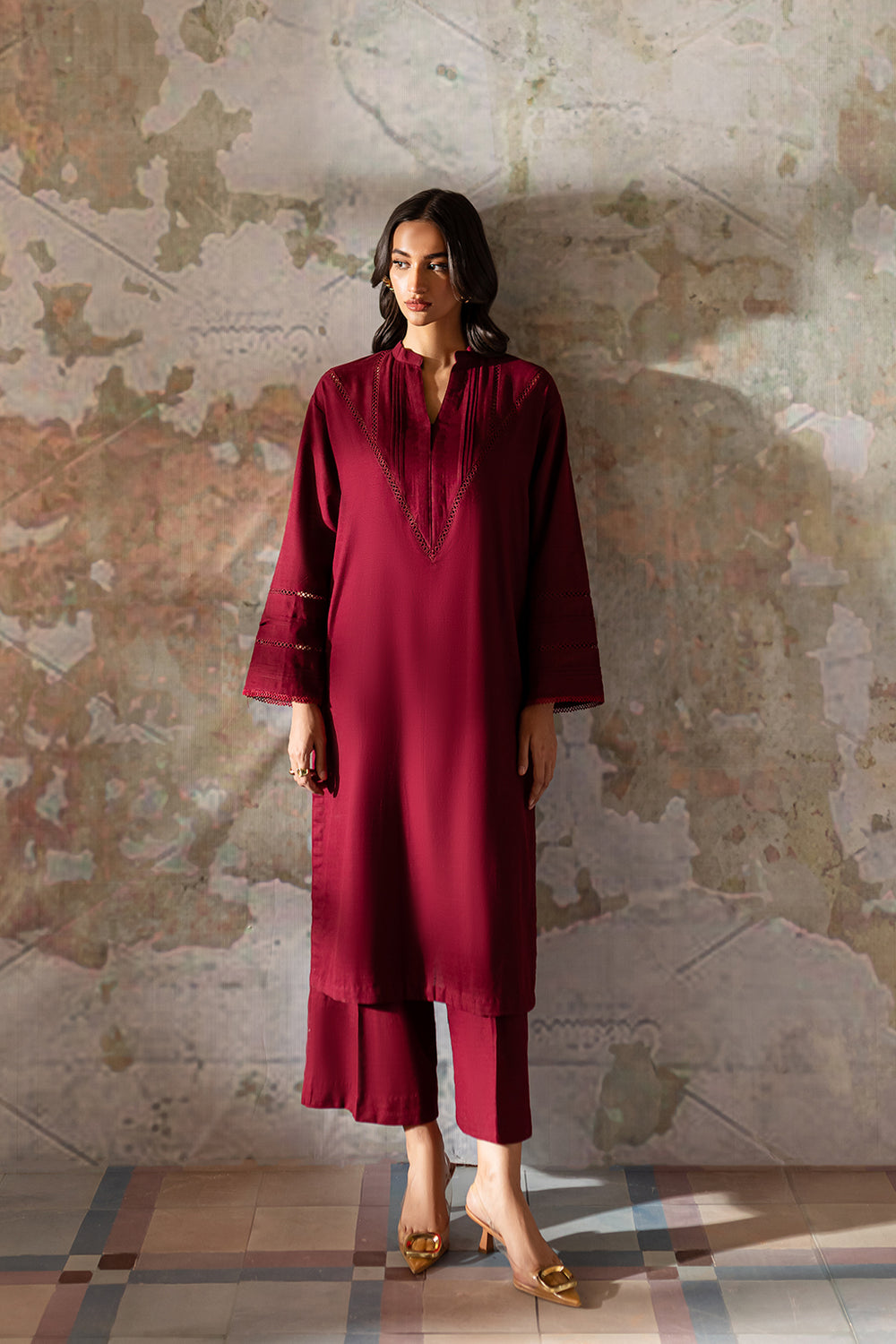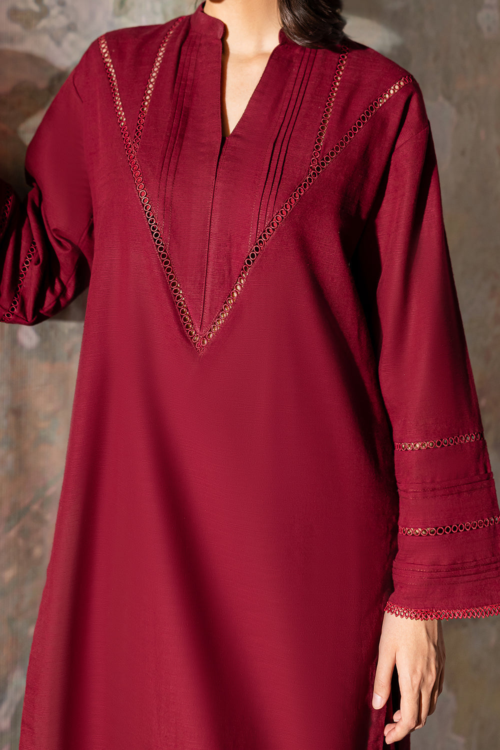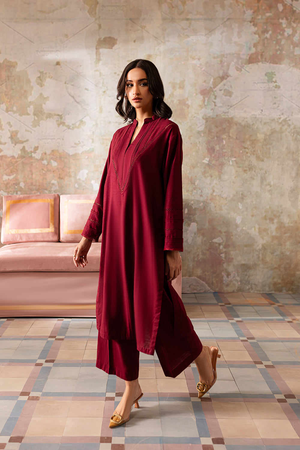 Deep maroon shirt with lace detailing stitching, paired with wide legged trousers
