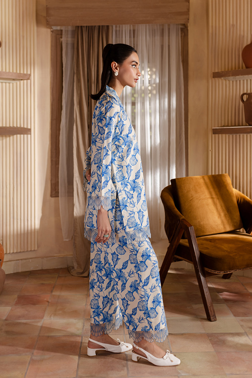Floral print shirt with embroidered neck, cuffs & Daman, paired with wide legged trousers