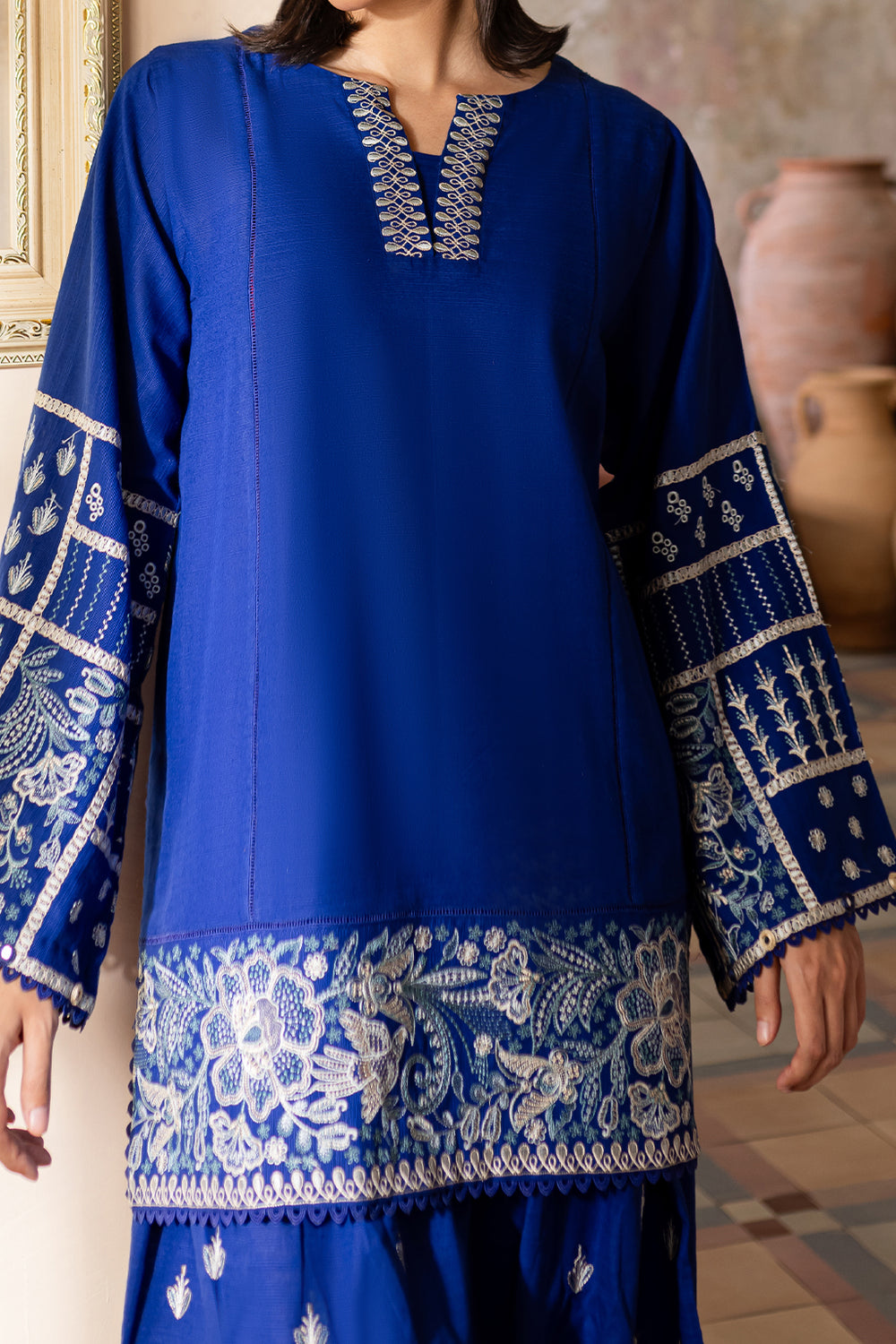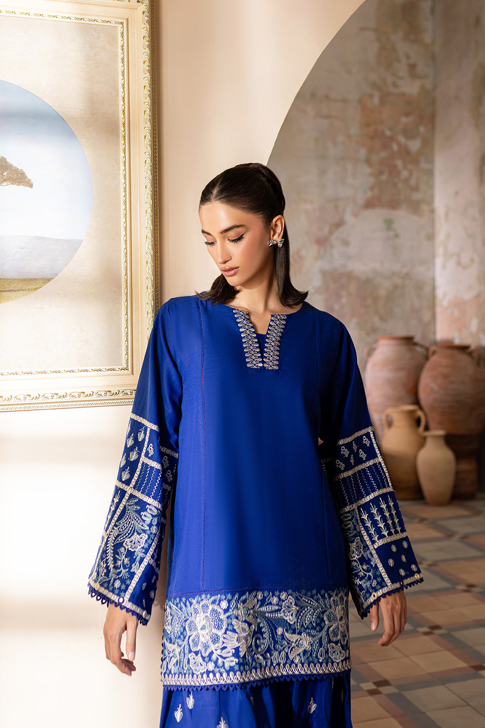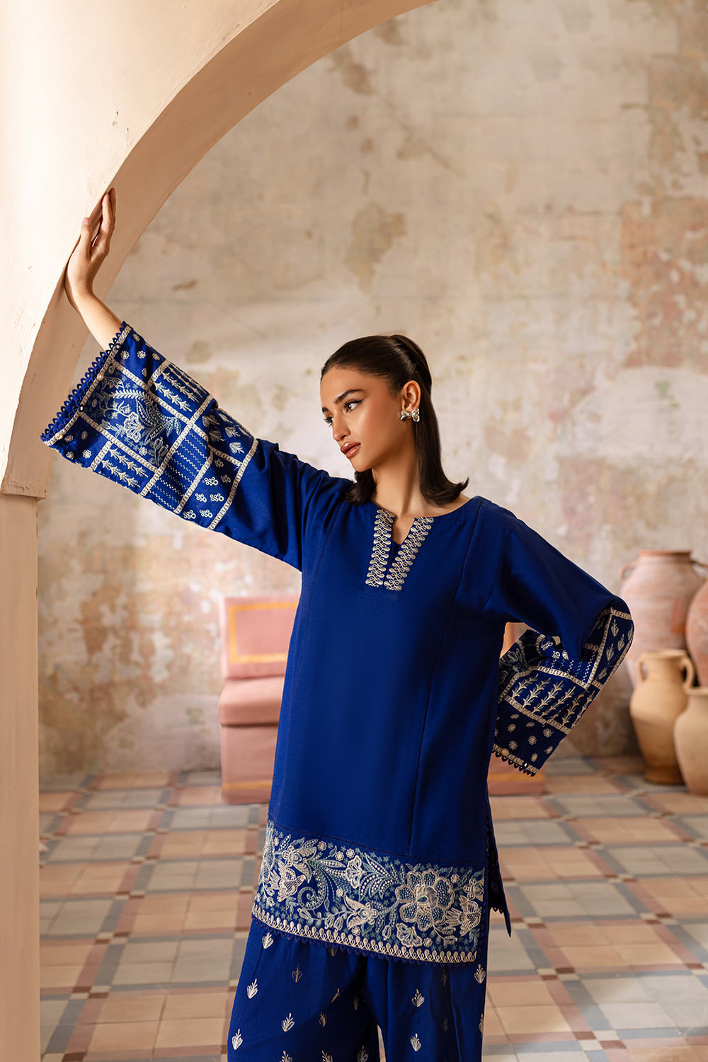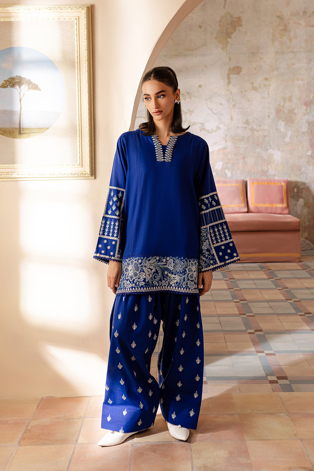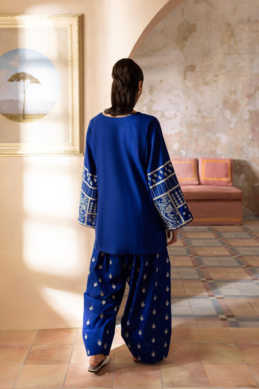 Royal blue embroidered shirt, paired with all over embroidered shalwar