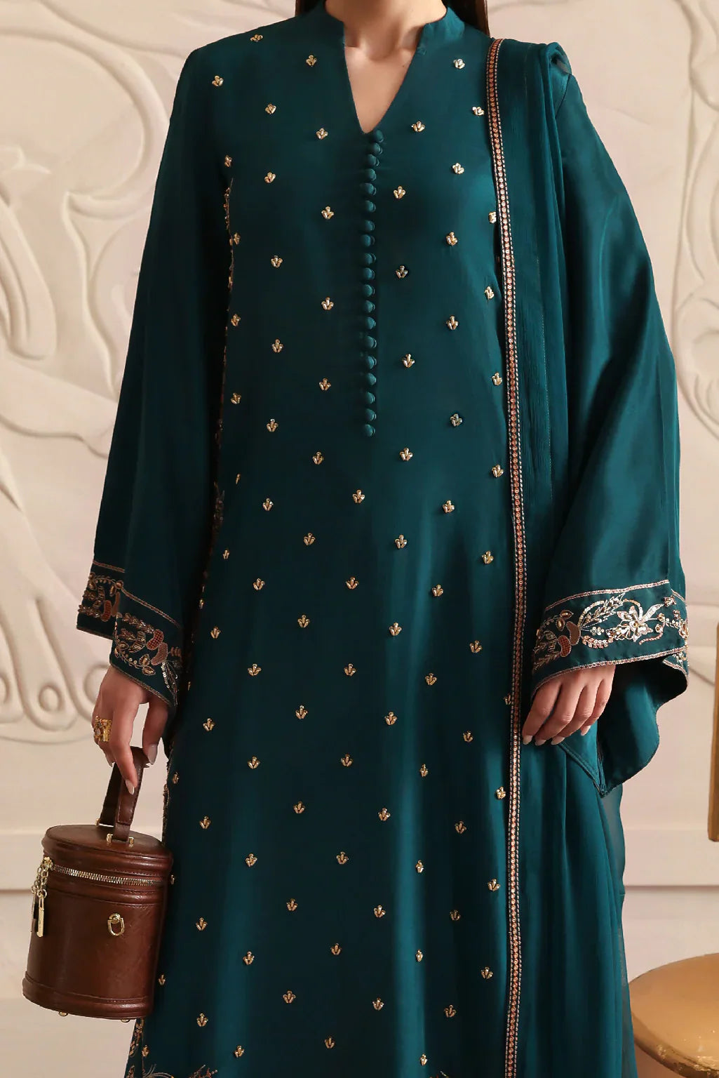 Long teal shirt richly embroidered and embellished with flared sleeves, paired with cigarette pants and a chiffon dupatta finished with embroidered borders
