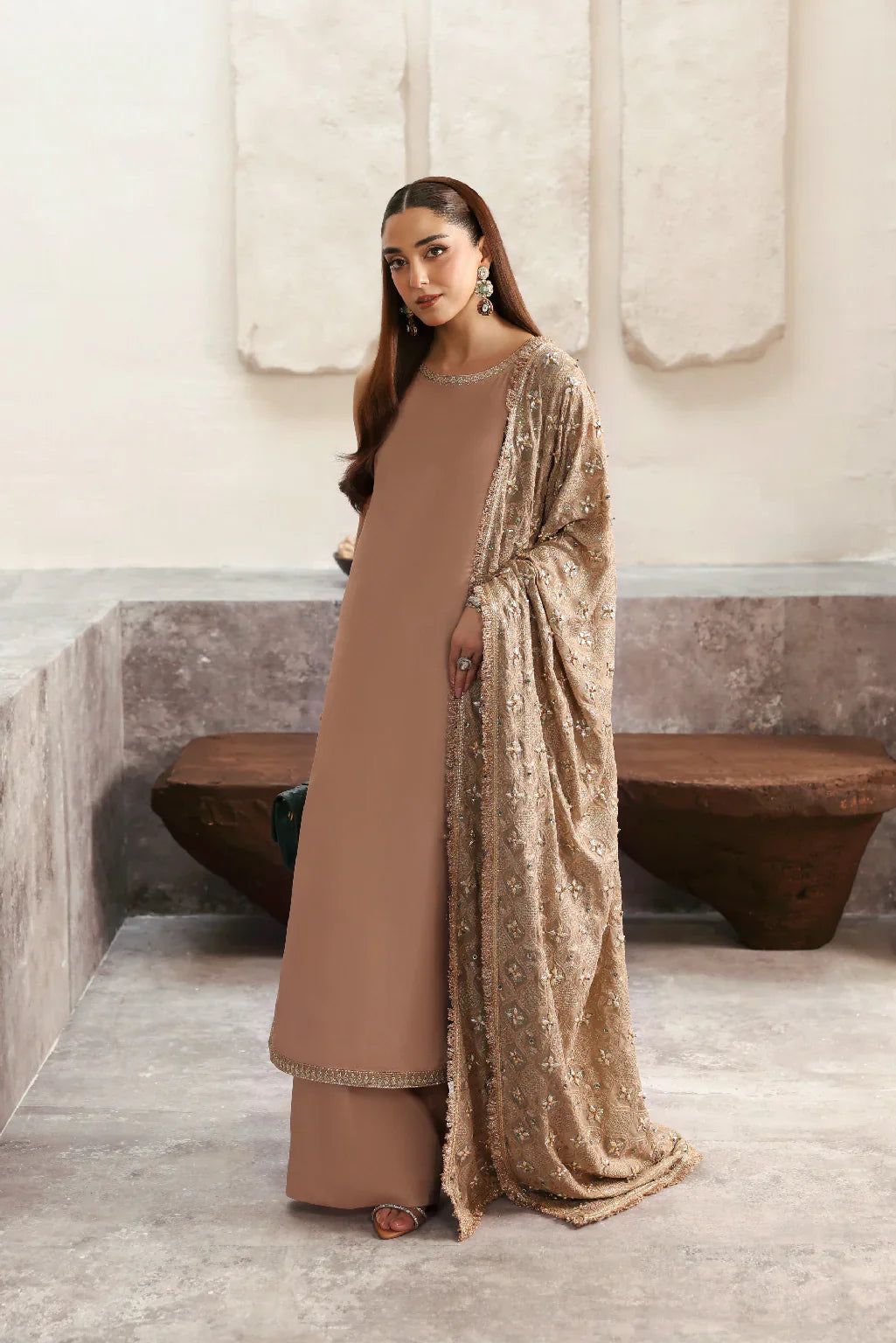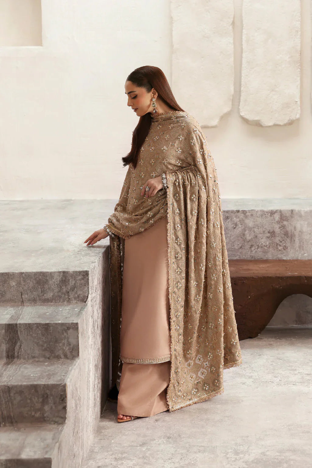 A luxe beige-gold embellished shawl styled with a raw silk long shirt adorned with intricate embroidered borders and tassels, paired gracefully with raw silk trousers