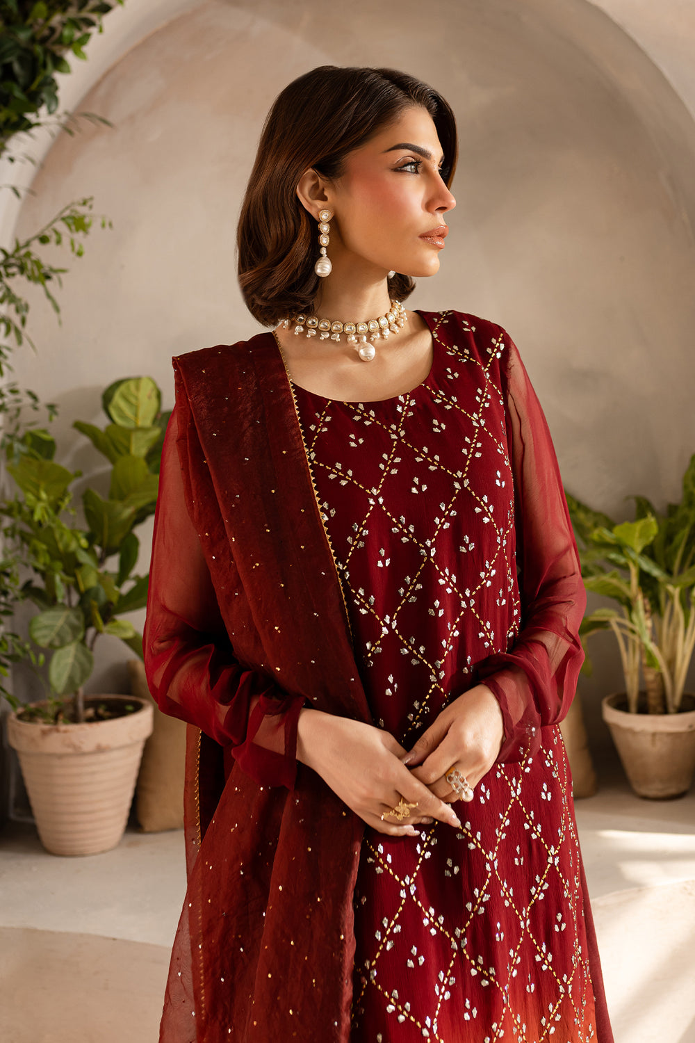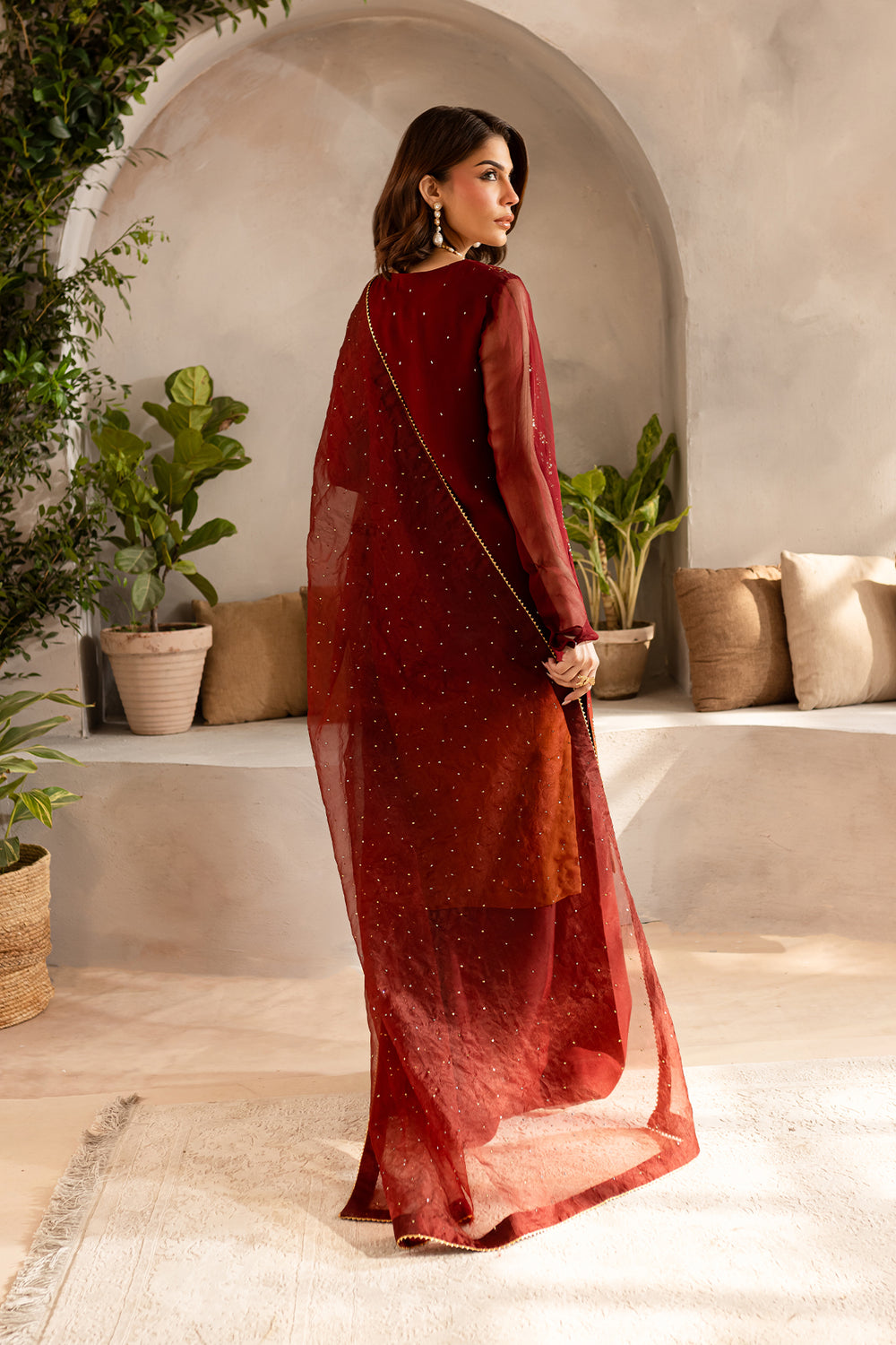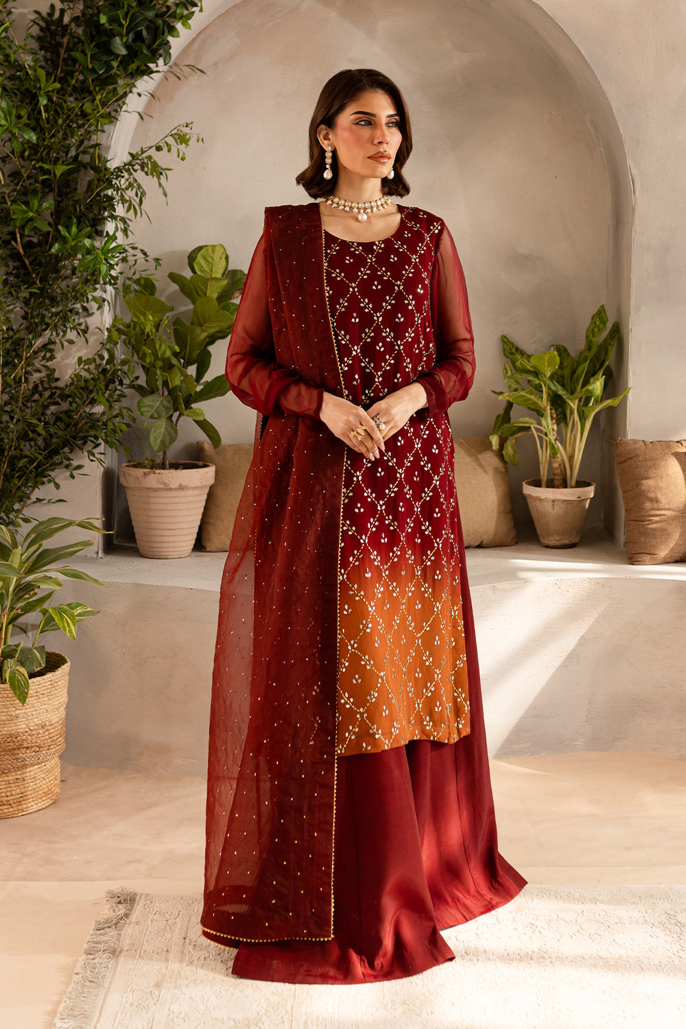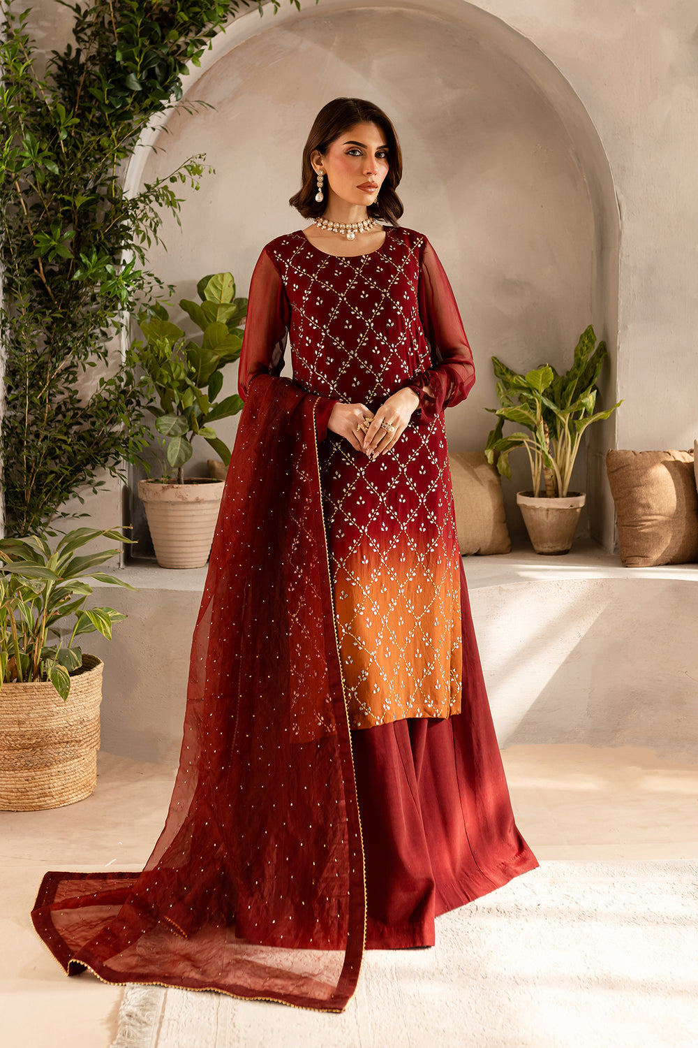 Maroon rust two tone chiffon shirt with delicate mukaish work paired with raw silk wide legged plazo and mukaish work organza dupatta.