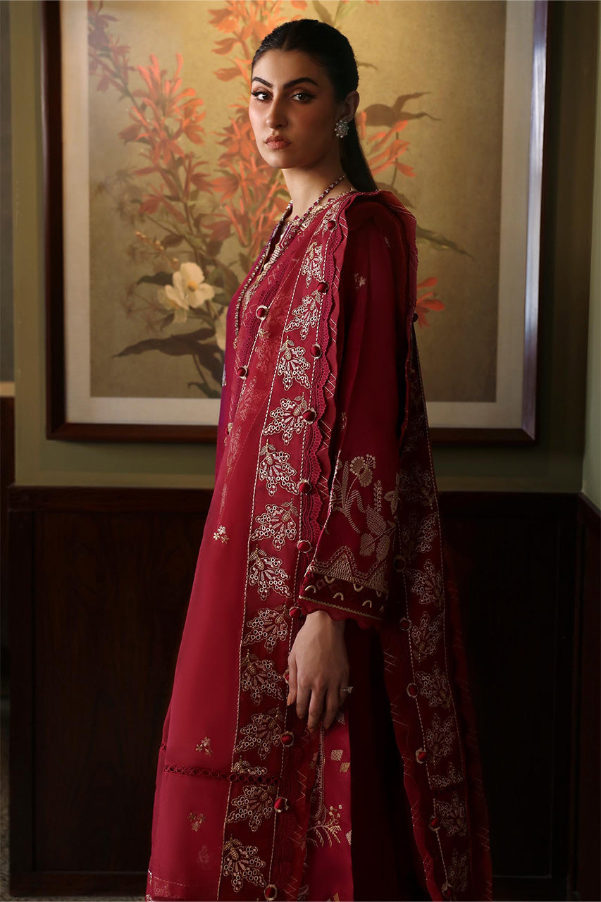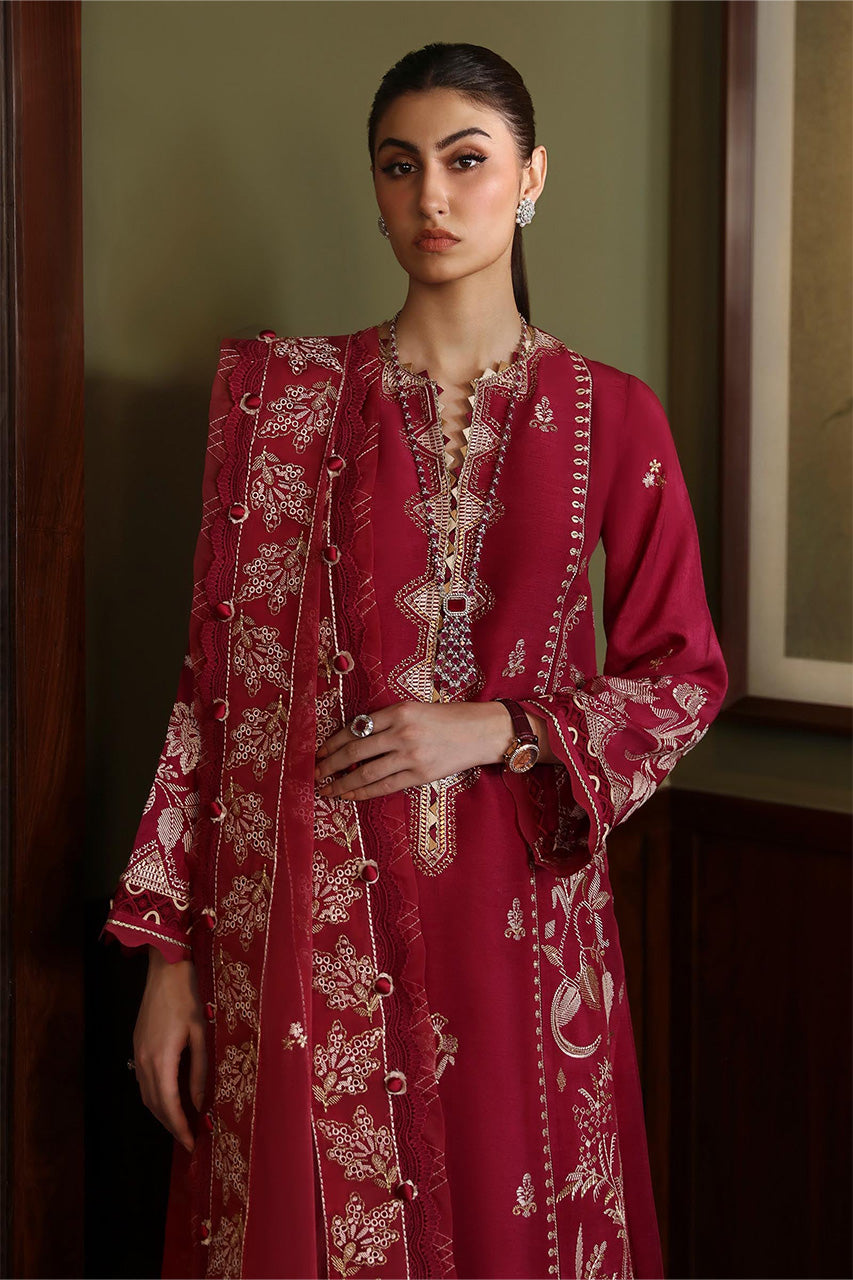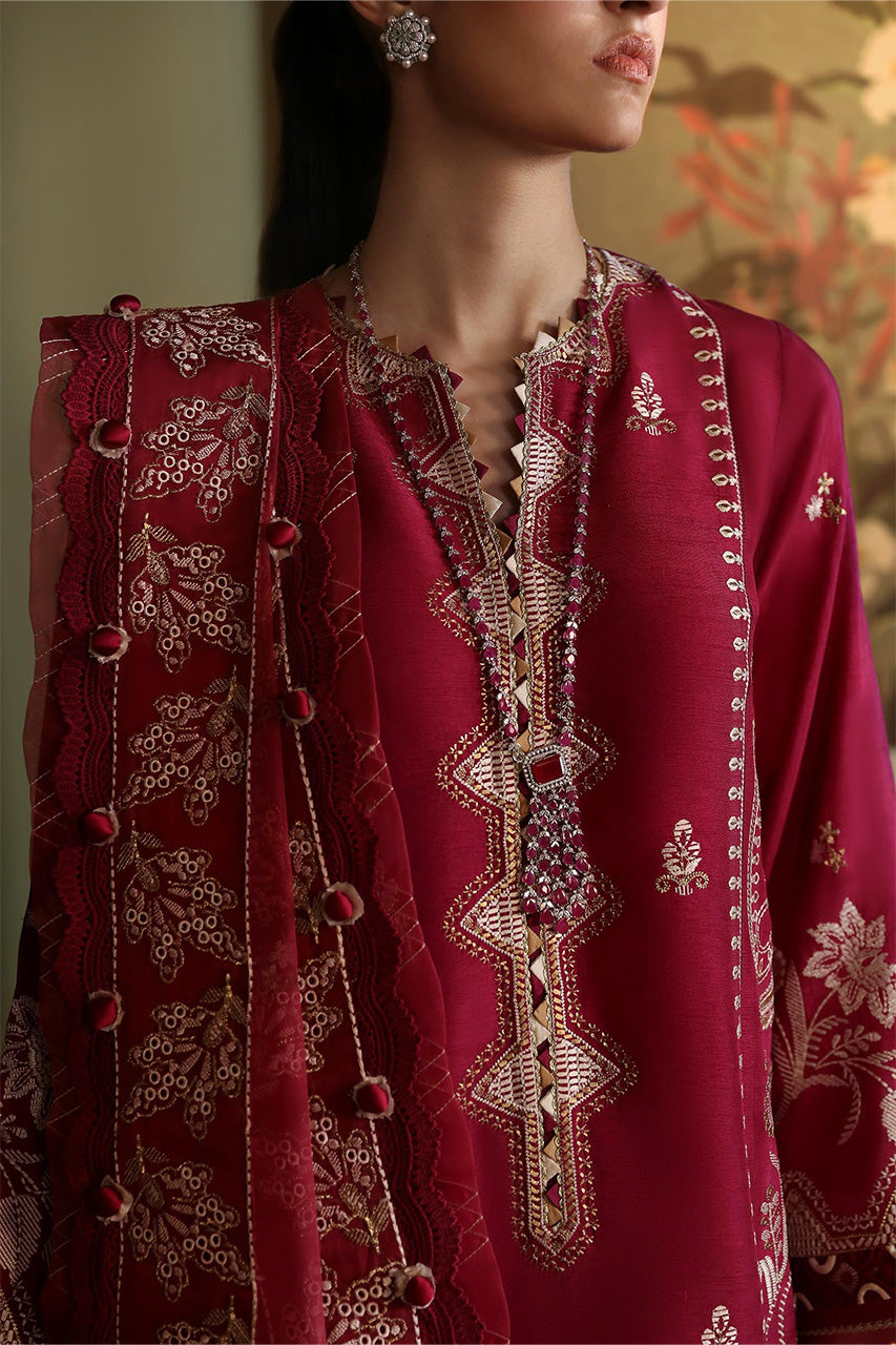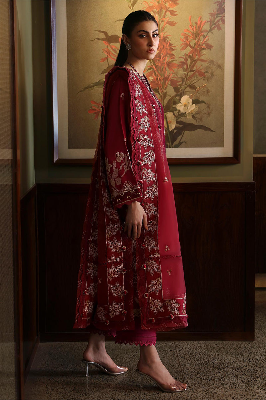 On a sumptuous grenat canvas, 'Amarante' enchants with delicate smoky white embroideries, crafting a captivating tapestry of elegance and allure. Paired with a lavishly embroidered organza dupatta and straight trousers featuring intricately detailed cuffs, this exquisite ensemble radiates sophistication, making it the perfect choice to elevate your soirées with an air of refined glamour.