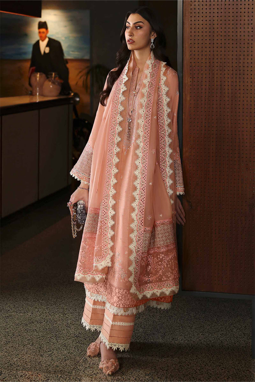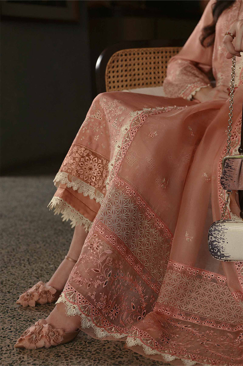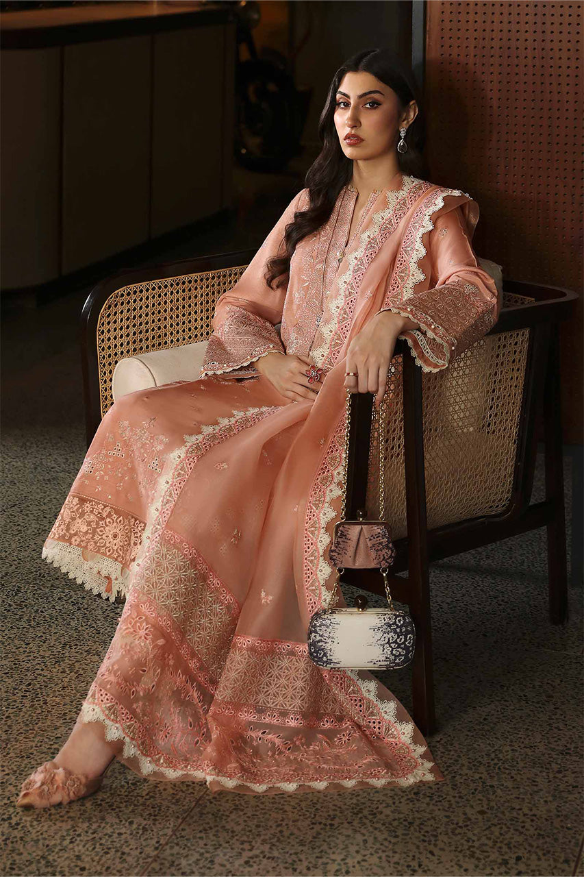 “Ambre' unfolds on a captivating salmon peach canvas, adorned with opulent ivory floral embroidery and bordered with delicate organza lace, evoking a sense of timeless allure. Paired with tonal trousers and a lavishly embroidered organza dupatta, this ensemble exudes effortless sophistication, making it the perfect choice for an elegant and refined brunch affair.