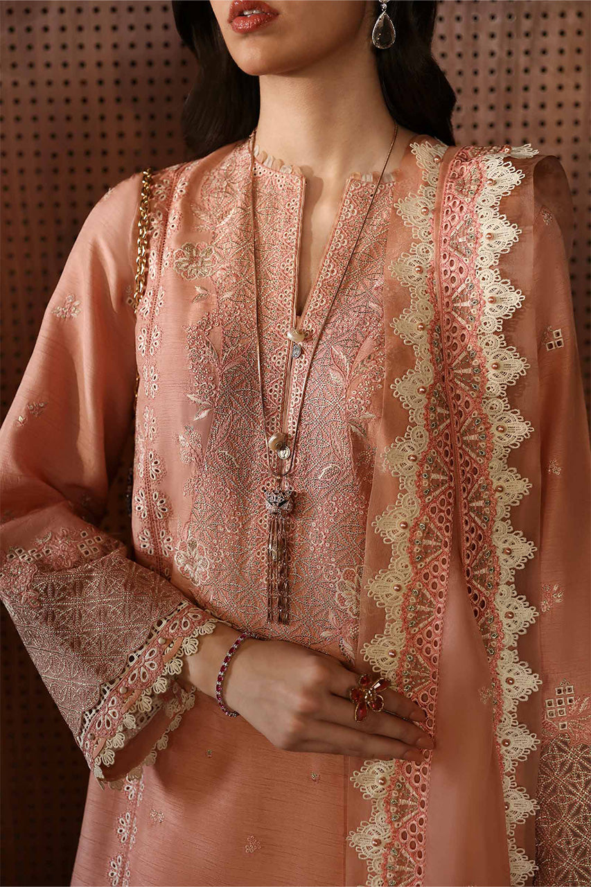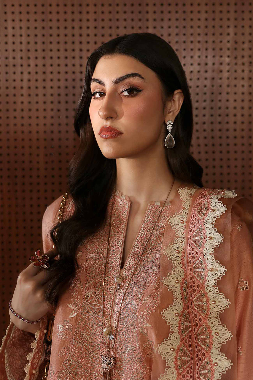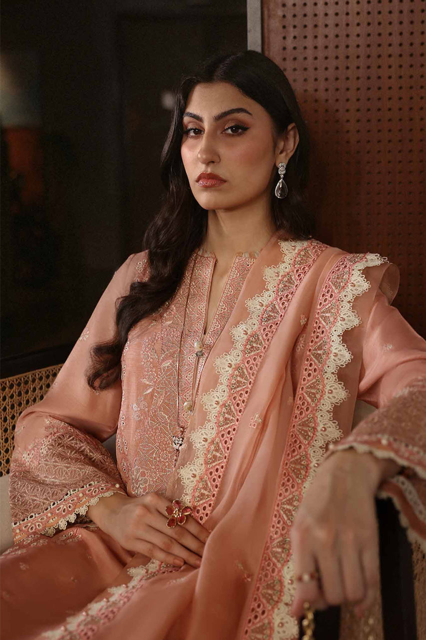 “Ambre' unfolds on a captivating salmon peach canvas, adorned with opulent ivory floral embroidery and bordered with delicate organza lace, evoking a sense of timeless allure. Paired with tonal trousers and a lavishly embroidered organza dupatta, this ensemble exudes effortless sophistication, making it the perfect choice for an elegant and refined brunch affair.