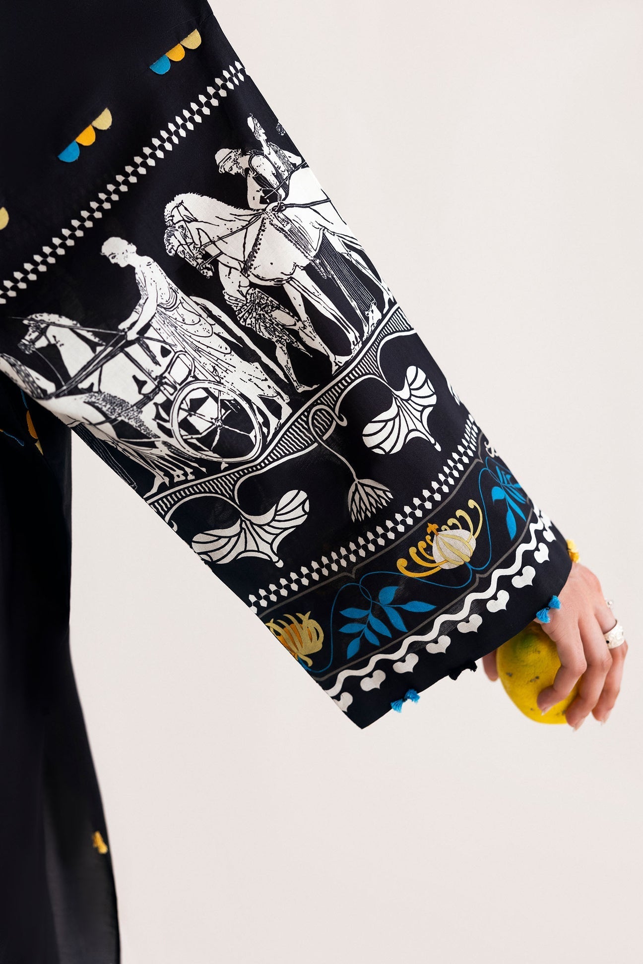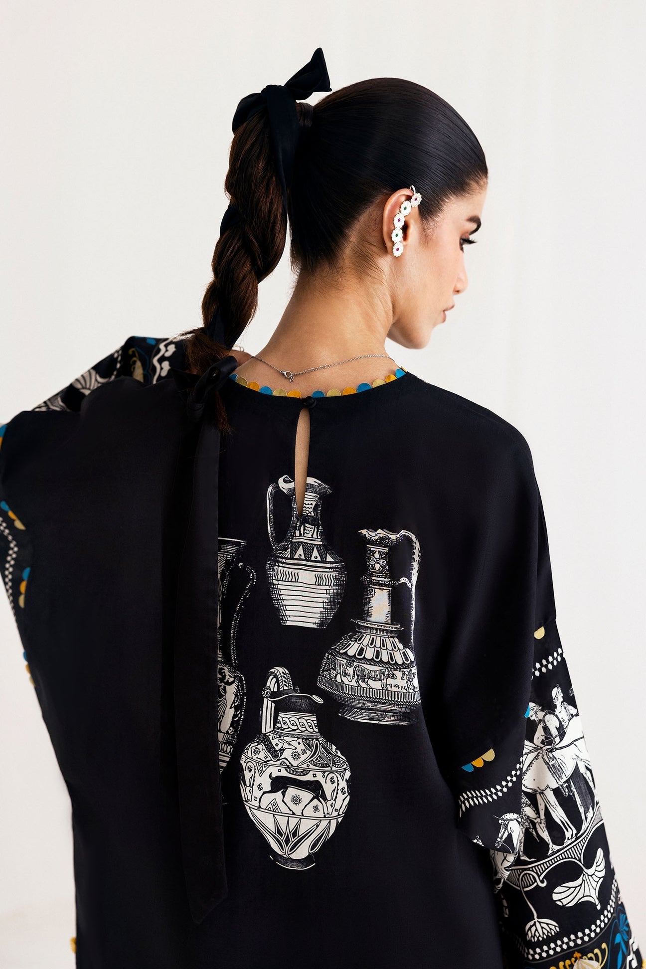 Liyana — where ancient artistry meets modern minimalism. Crafted on an obsidian black canvas, this striking silhouette features serene white motifs that echo Egyptian elegance, while hand-drawn horses dance across the sleeves in quiet motion. The back tells a different story — adorned with beautifully illustrated Greek vases, steeped in timeless allure.