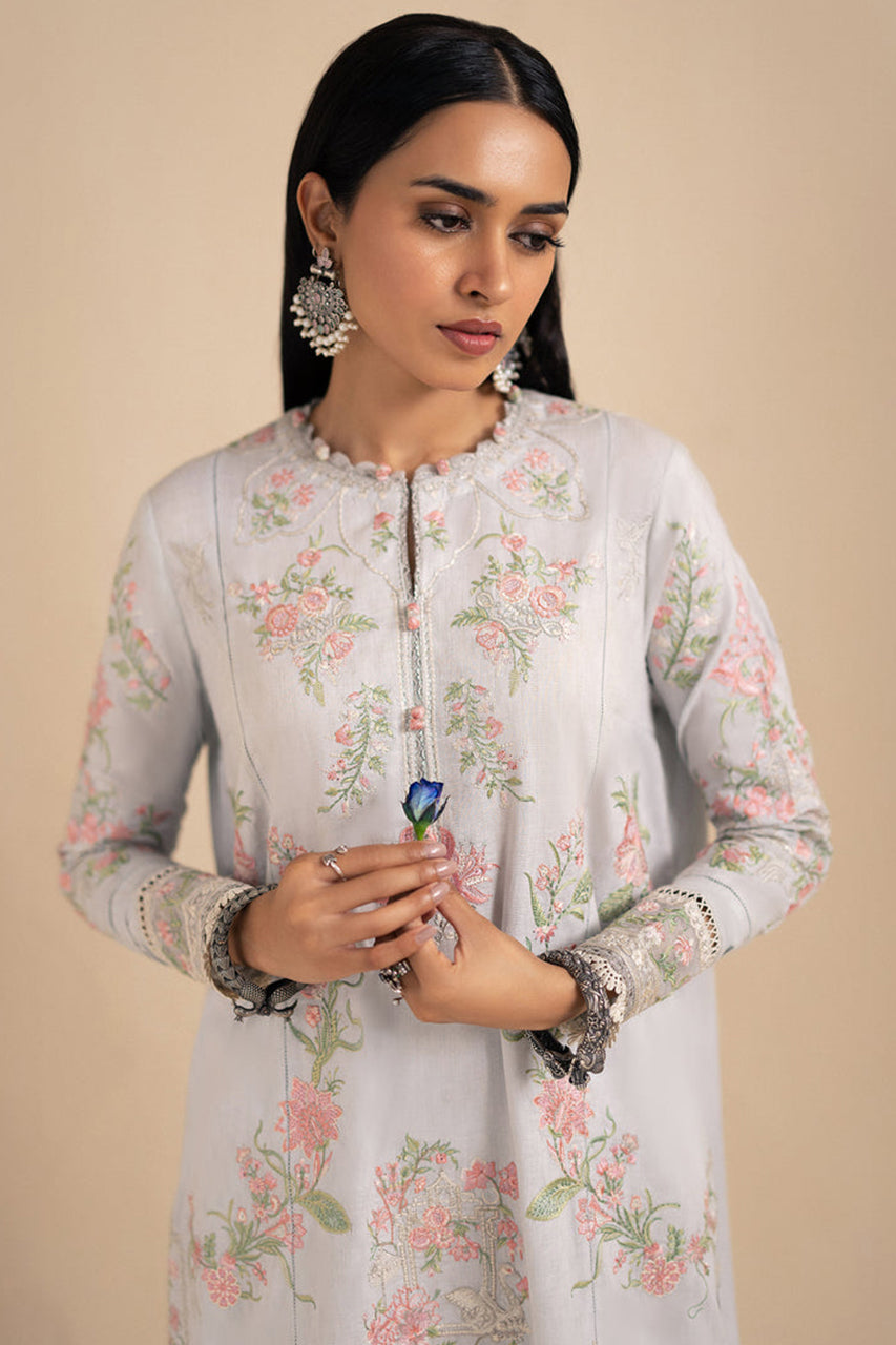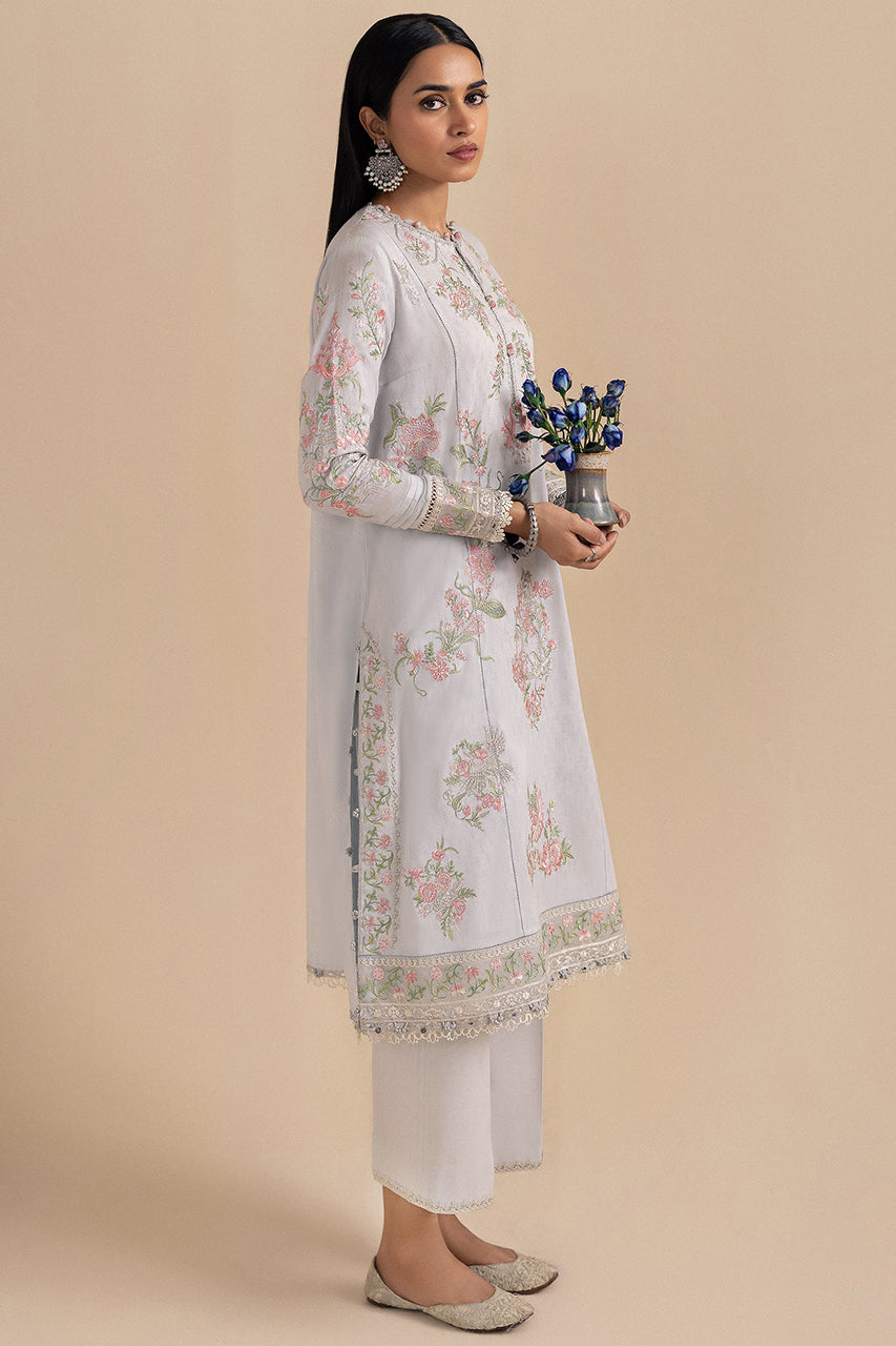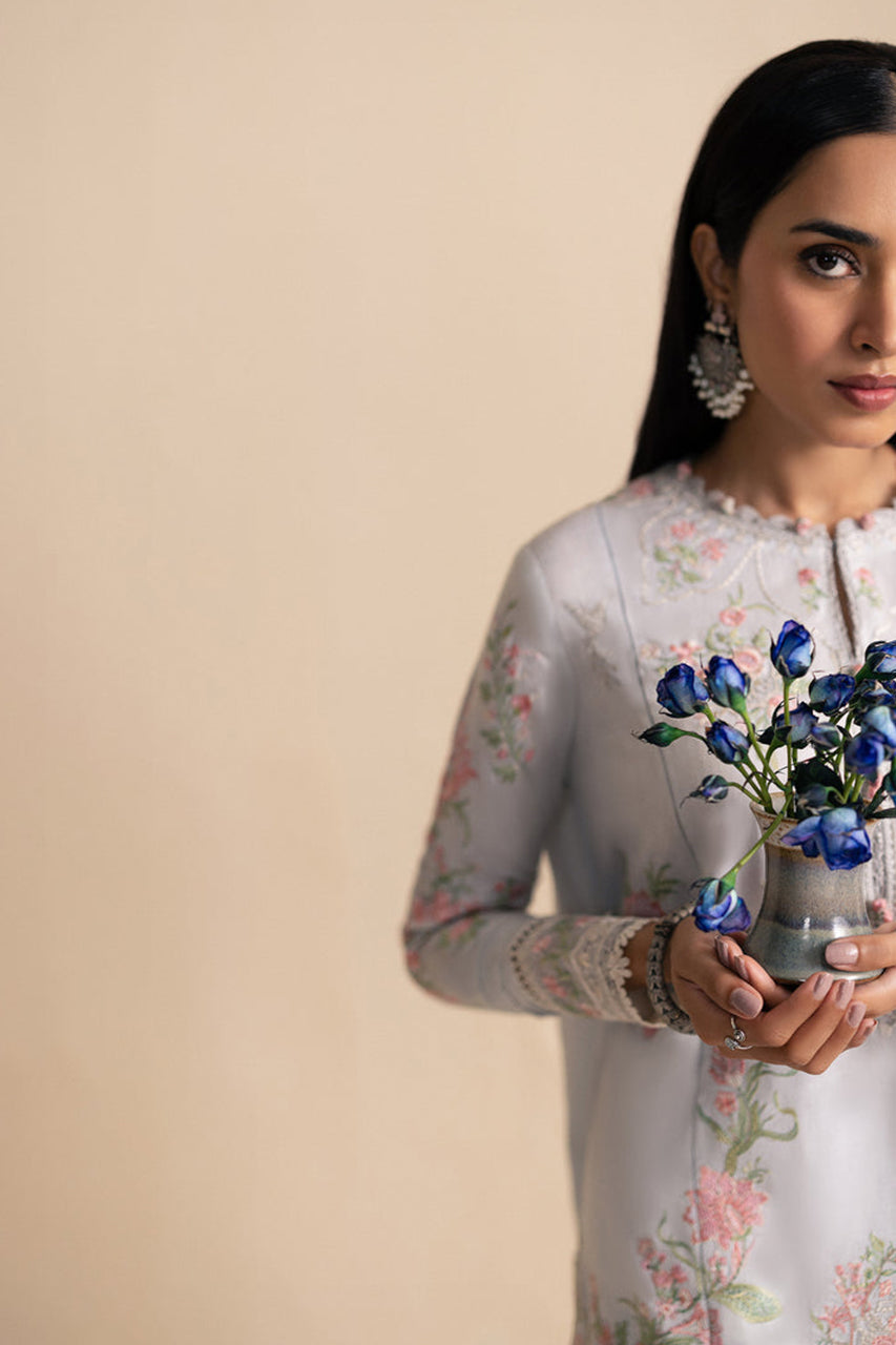 Introducing 'Sarbi,' an enchanting ensemble that beautifully embodies the essence of fall. A dreamy floral composition is intricately etched onto a serene sky canvas, capturing the tranquility of autumn skies. Rich accents of coral and sage breathe life into the fabric, transforming it into a stunning embroidered garden filled with the vibrant hues of the season. Each petal is a testament to exquisite artistry, celebrating the warm, inviting spirit of fall and the beauty of nature’s transition. 'Sarbi' invites you to embrace the elegance of autumn in all its untamed glory.