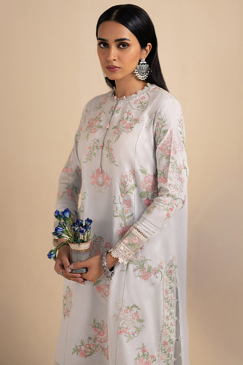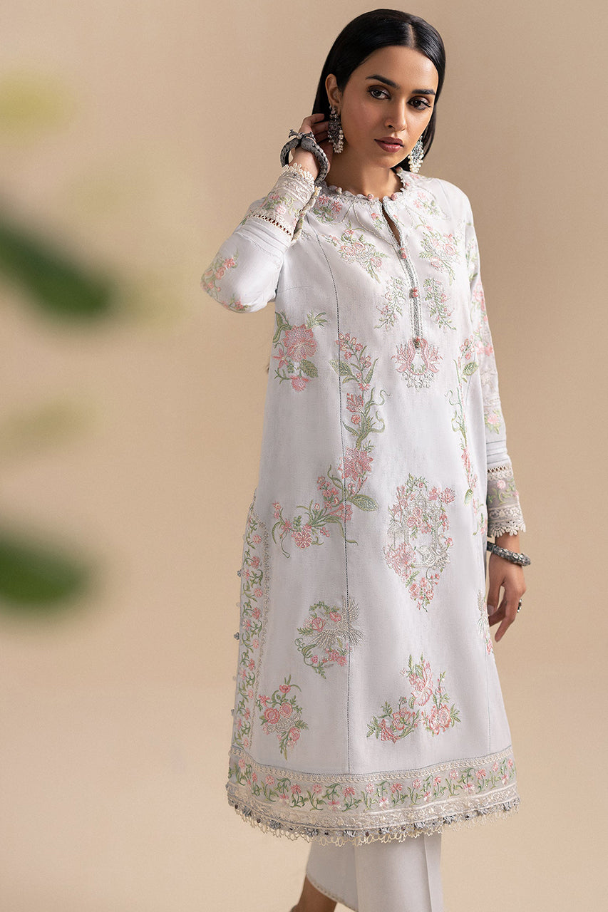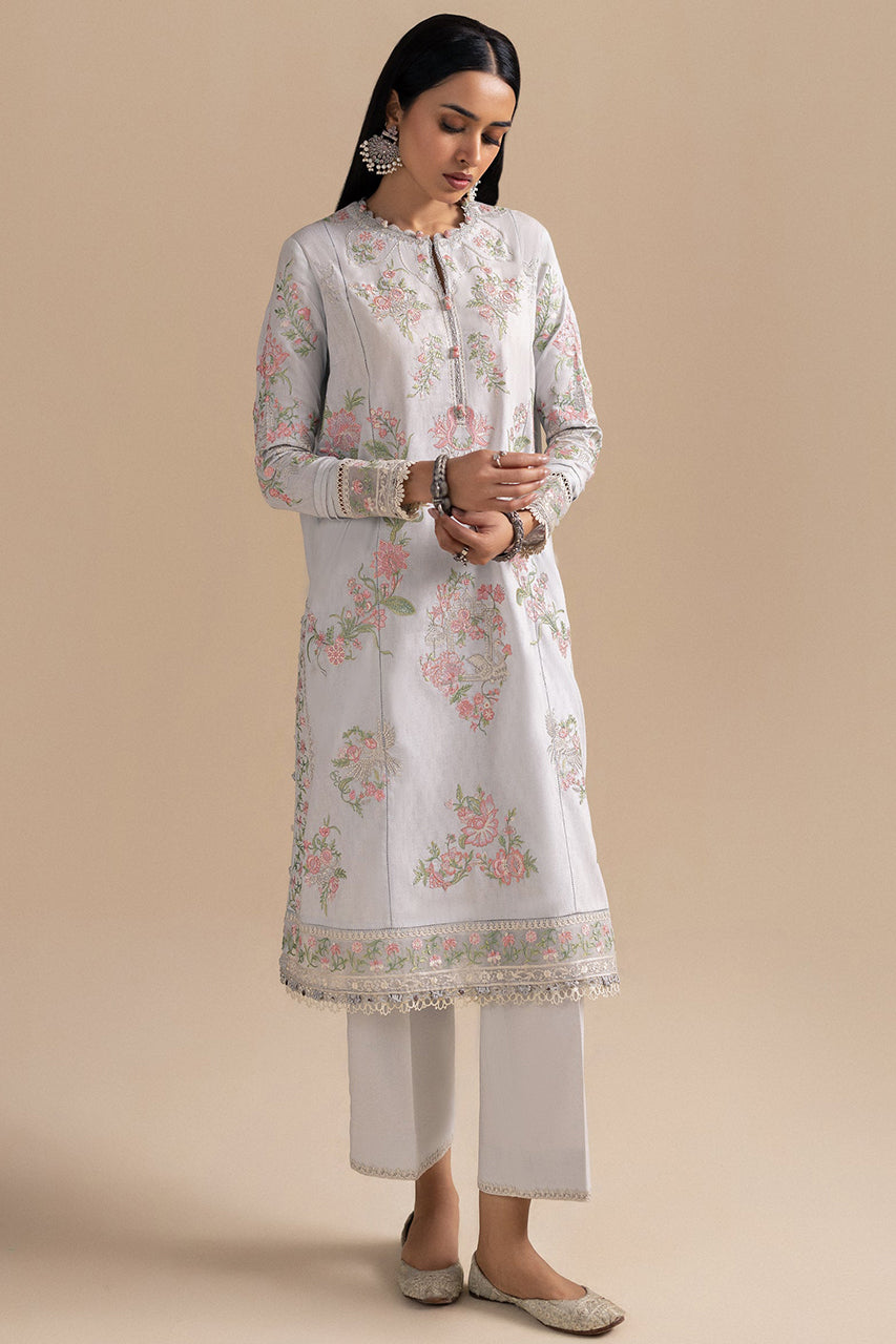 Introducing 'Sarbi,' an enchanting ensemble that beautifully embodies the essence of fall. A dreamy floral composition is intricately etched onto a serene sky canvas, capturing the tranquility of autumn skies. Rich accents of coral and sage breathe life into the fabric, transforming it into a stunning embroidered garden filled with the vibrant hues of the season. Each petal is a testament to exquisite artistry, celebrating the warm, inviting spirit of fall and the beauty of nature’s transition. 'Sarbi' invites you to embrace the elegance of autumn in all its untamed glory.