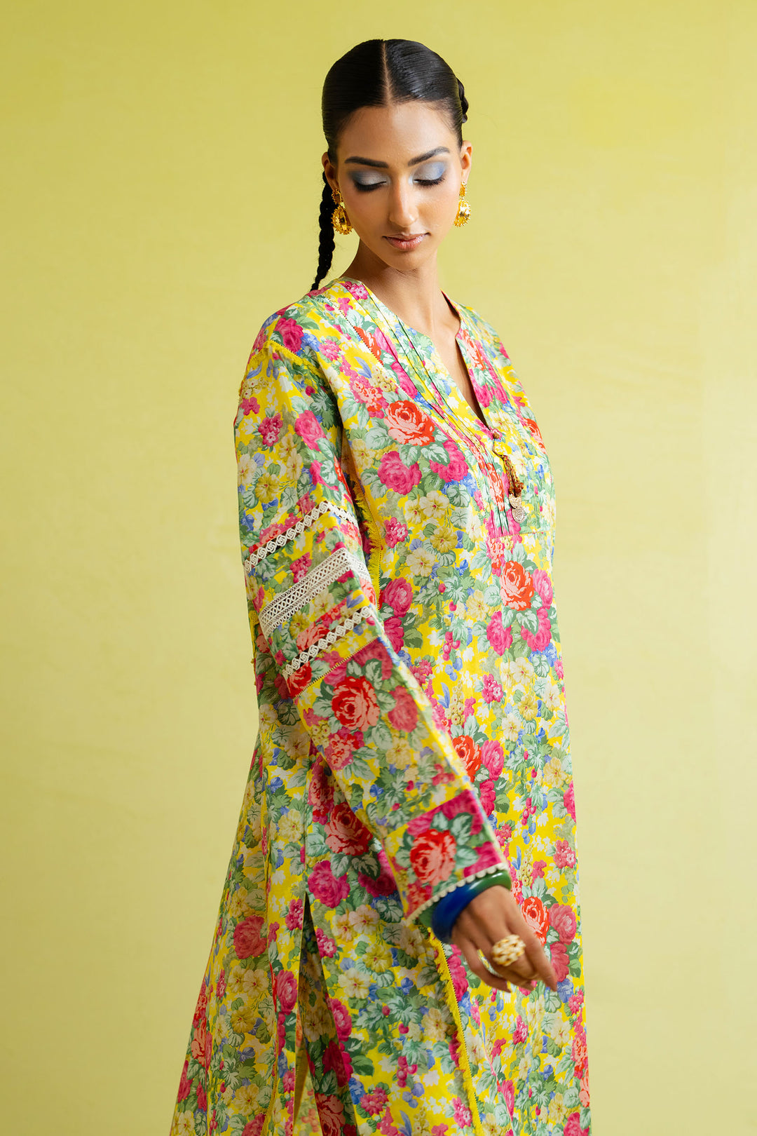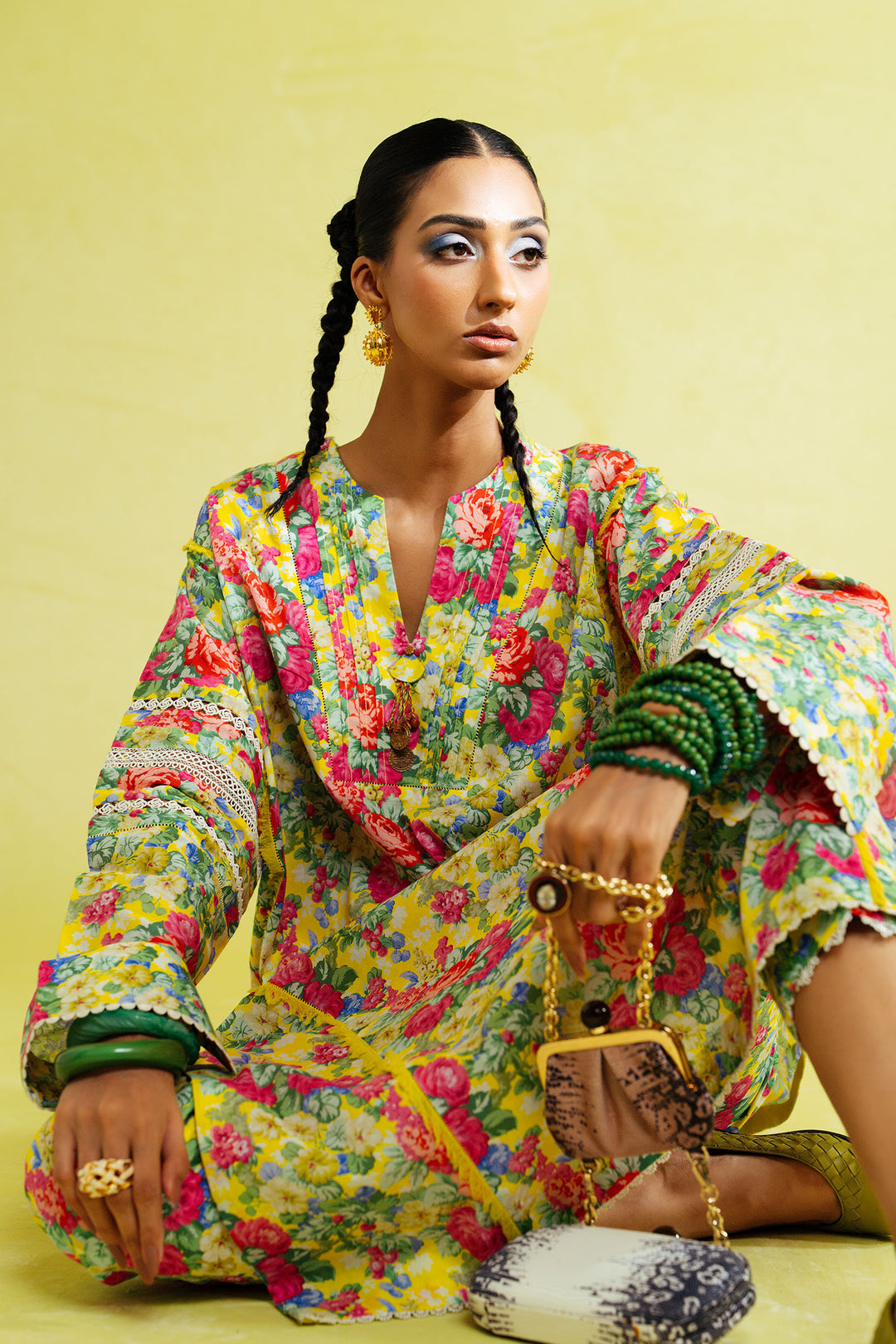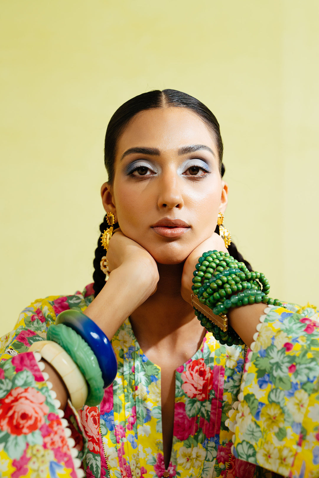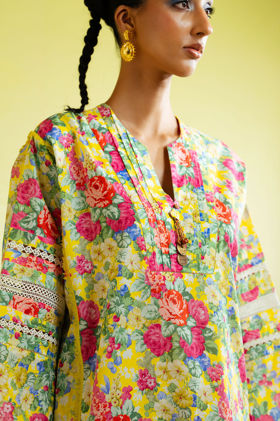 A bloom that doesn’t whisper — it speaks. Petal Riot is a fearless celebration of color and print, crafted for the Zaha girl who lives life in full bloom. Vibrant florals in lemon, fuchsia, and jade cascade across the canvas, while delicate ivory lace trims the sleeves with just the right touch of softness. Paired with printed pants in a matching floral pattern, the look doubles down on bold — embracing full print-on-print energy with effortless ease.