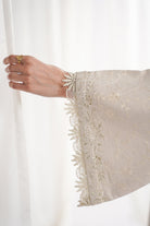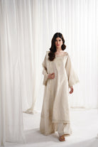 This ivory 3-piece set exudes luxury and sophistication with its exceptionally detailed design. The outfit is adorned with exquisite thread and tilla shifli embroidery, paired with a beautifully crafted cutwork boat neckline, featuring intricate handwork that elevates the entire ensemble. The wide-hem long sleeves are a standout feature, offering unmatched elegance. The look is completed with a beautifully embroidered shifli dupatta and wide-hem floor-length trouser, creating a cohesive and luxurious appearance that promises to turn heads. This modern yet timeless piece is the perfect choice for a statement occasion.