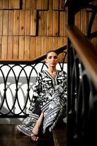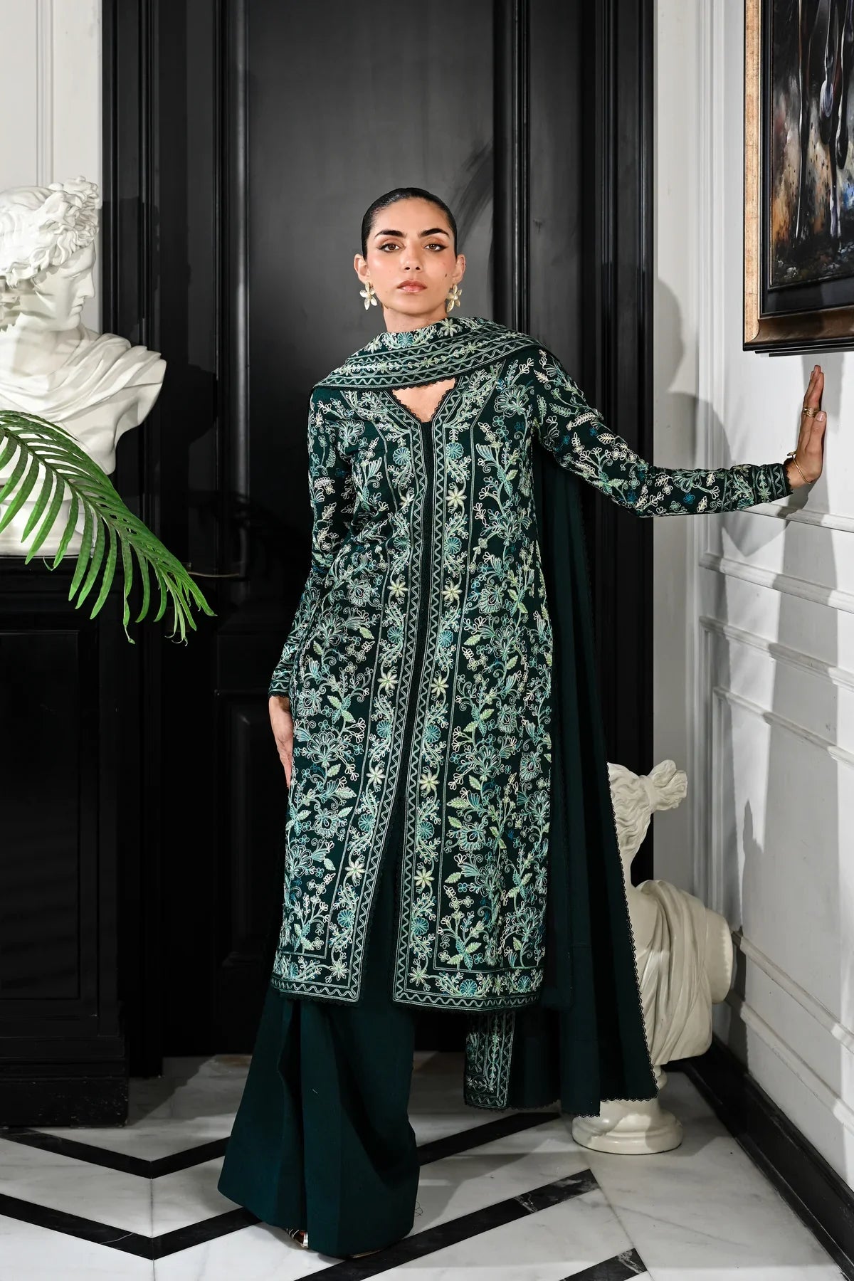 This exquisite dark green karandi ensemble is beautifully adorned with intricate thread embroidery in contrasting shades, creating a striking and elegant design. The long embroidered shirt features detailed floral and geometric patterns, enhanced with a subtle neckline cut-out for a modern touch. Paired with a matching karandi trouser, it ensures a graceful yet comfortable fit. The ensemble is completed with a finely embroidered karandi shawl, adding sophistication and charm. Perfect for festive occasions and formal gatherings, this outfit is a true reflection of timeless elegance and refined craftsmanship.