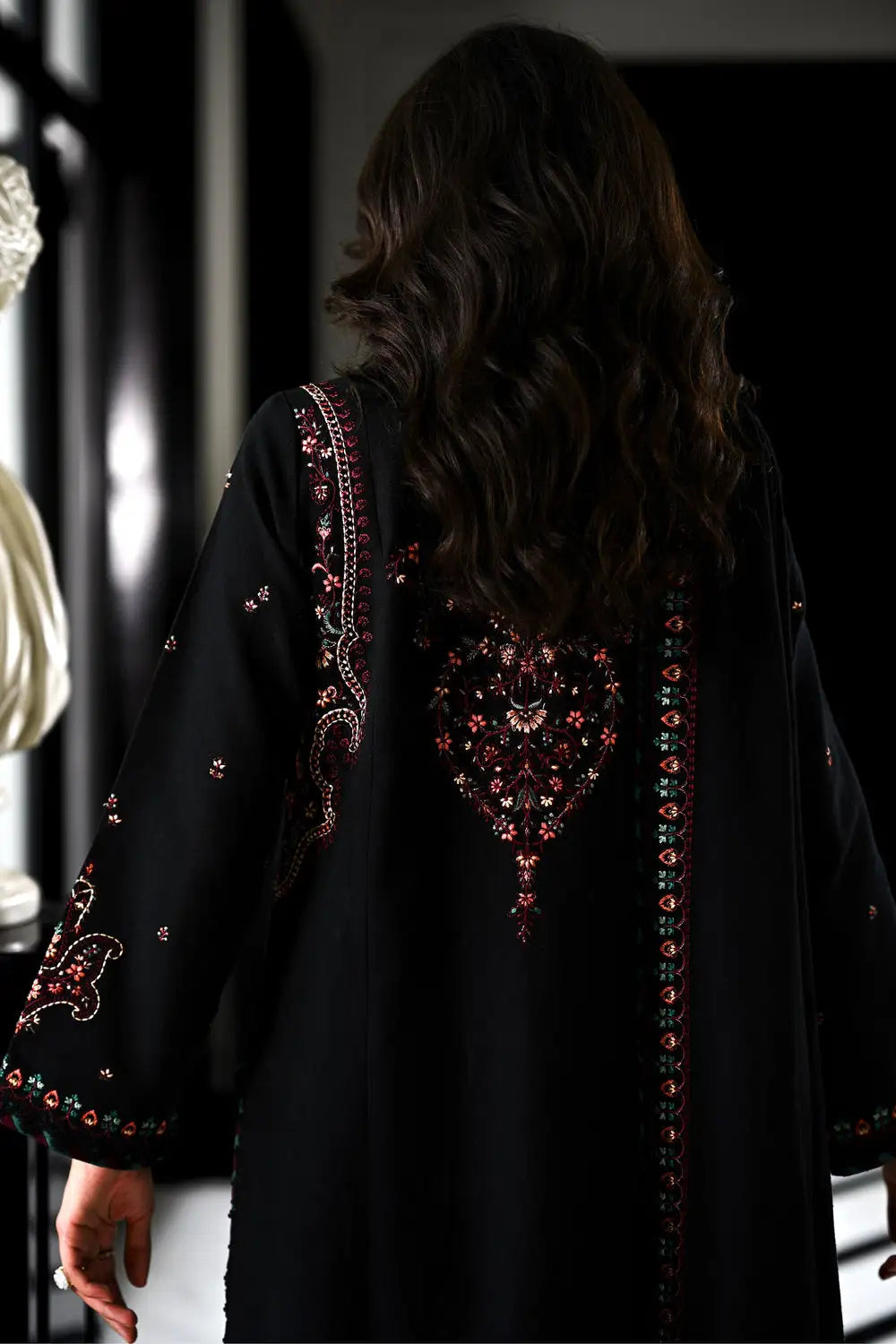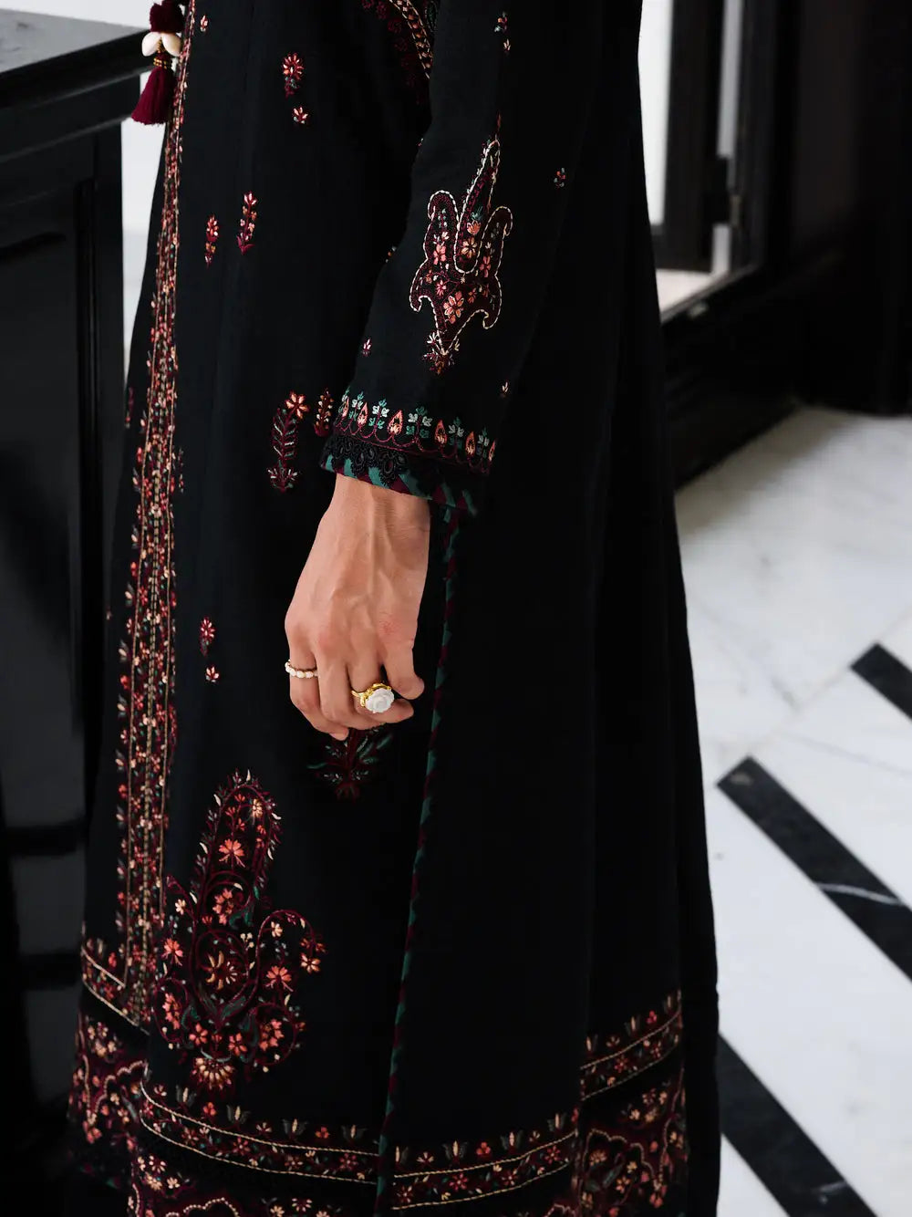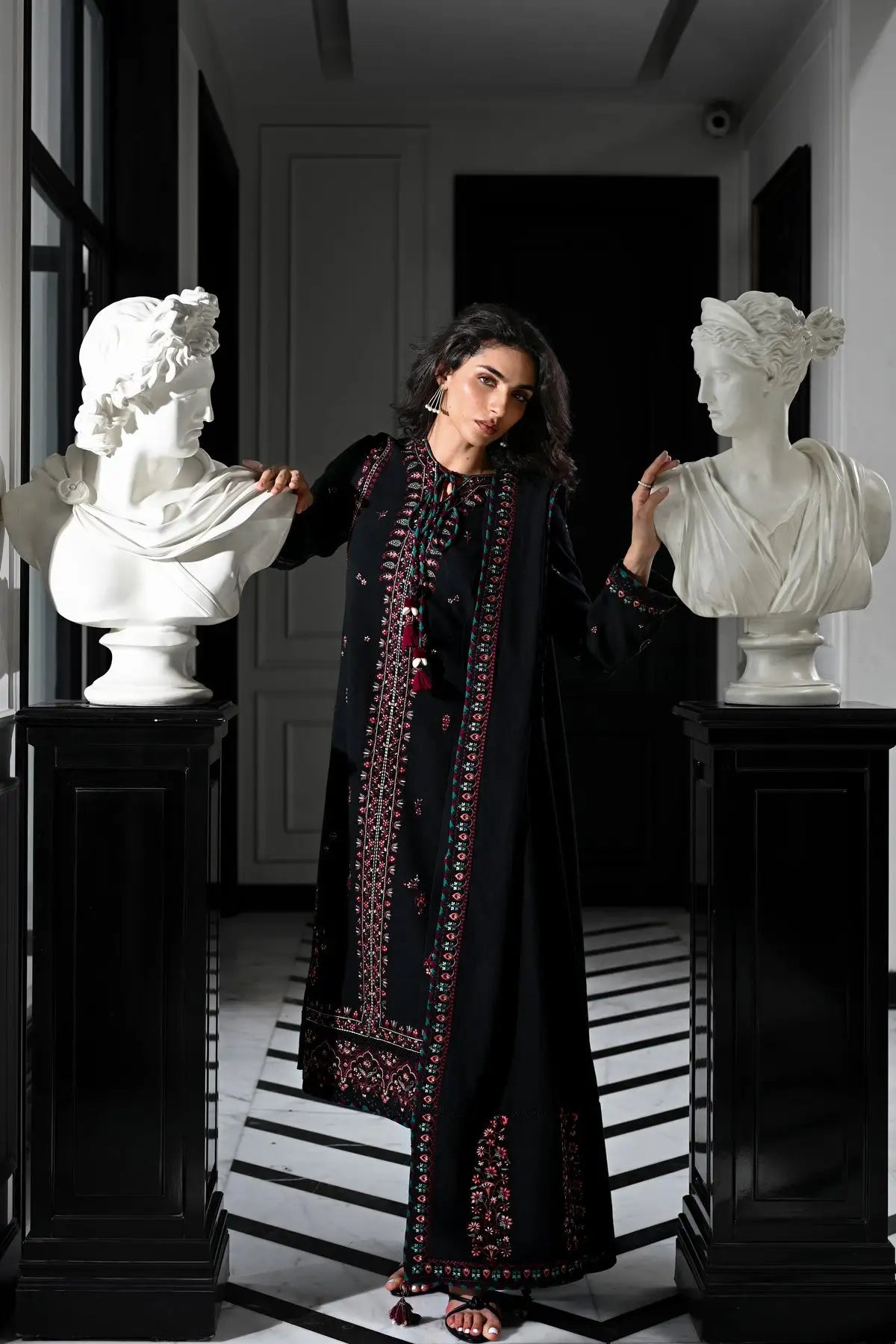 This elegant black karandi three-piece ensemble is designed with timeless sophistication. The embroidered karandi shirt features intricate maroon and rust-toned motifs along the neckline, borders, and sleeves, giving it a refined appeal. It is paired with a matching karandi trouser that complements the graceful design. The look is completed with an embroidered karandi shawl, adding depth and richness to the outfit. Perfect for evening wear and festive occasions, this ensemble beautifully merges tradition with modern elegance.