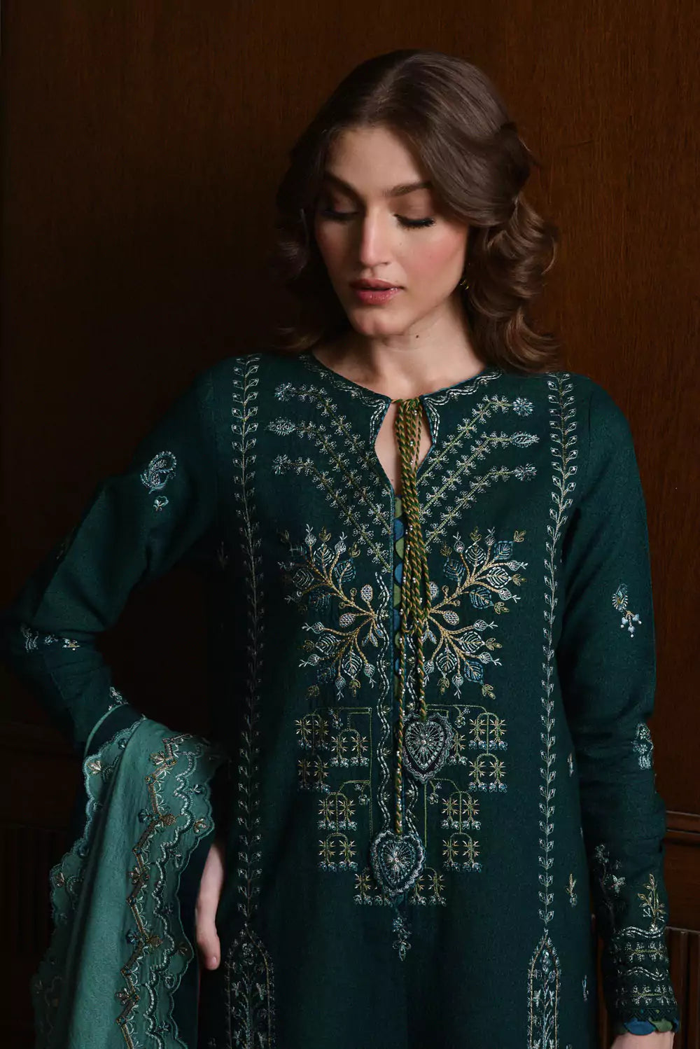 This beautiful three piece emerald green karandi suit ensemble features a long, straight-cut kameez (shirt) that is richly embroidered with intricate floral and vine patterns in a contrasting lighter shade, likely a beige or light gold. The detailed embroidery is concentrated on the neckline and extends down the front panel and hem, giving the outfit a luxurious feel. The suit includes matching emerald green trousers, which appear to be a sleek, modern cut with a subtle finishing at the cuff. A coordinating dupatta with a wide, embroidered border completes the set, harmonizing with the shirt's design. The textured karandi fabric makes this a warm and elegant choice, suitable for formal or festive occasions in cooler weather.