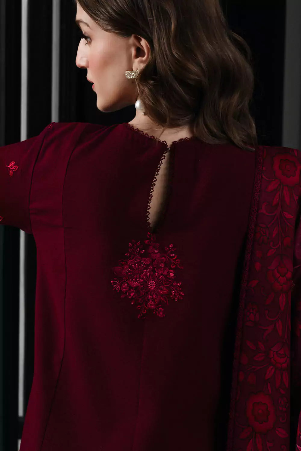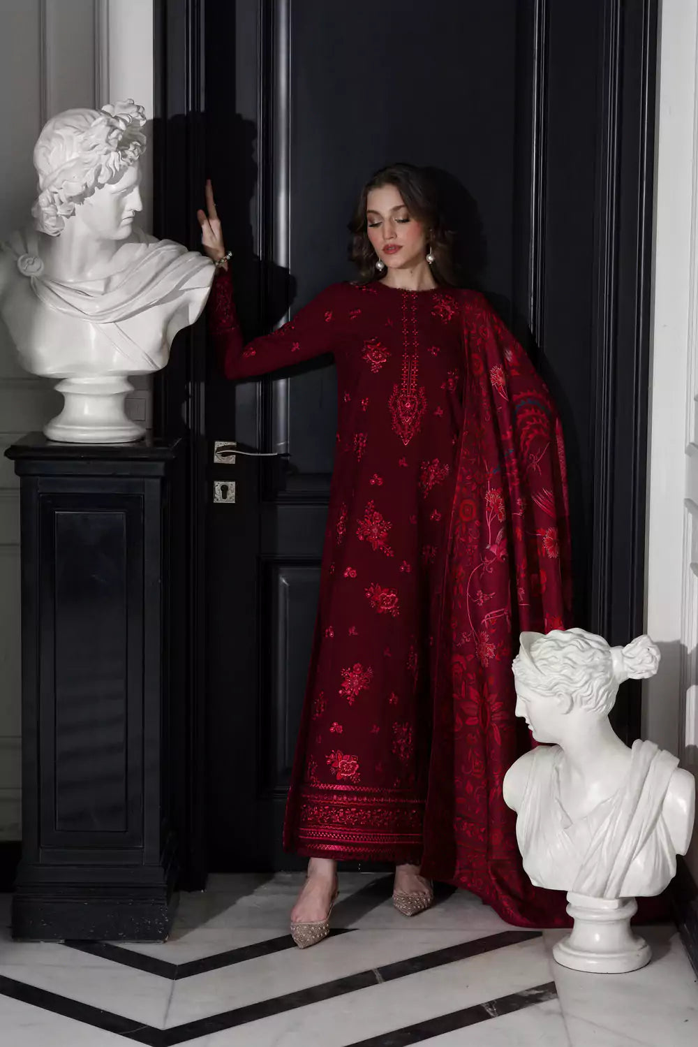 This exquisite maroon karandi three piece set is crafted with refined elegance. The embroidered karandi shirt is adorned with intricate traditional motifs, creating a rich and graceful look. It is paired with a matching karandi trouser for a classic silhouette. The ensemble is completed with an digital printed wool shawl, adding depth and sophistication. Perfect for festive occasions and winter gatherings, this outfit reflects timeless charm and luxurious craftsmanship.