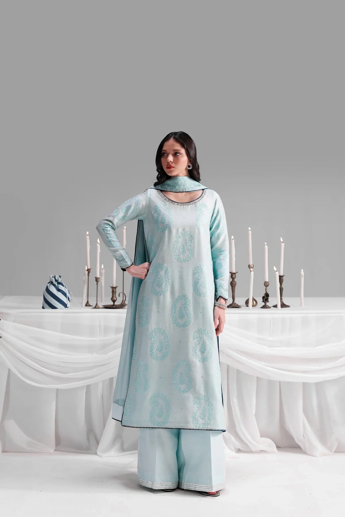 This enchanting ice blue ensemble is crafted from luxurious embroidered raw silk, adorned with intricate silver sequins, bugle beads, naqshi, and gota embellishments around the neckline and sleeve cuffs. The refined detailing adds a subtle shimmer, enhancing the outfit’s timeless appeal. It is paired with elegant palazzo pants featuring delicate gota accents, creating a harmonious and graceful silhouette. Completing the look is an embroidered chiffon dupatta, radiating classic charm with its airy elegance. Perfect for weddings, festive celebrations, and formal soirées, this design blends sophistication, tradition, and understated glamour.