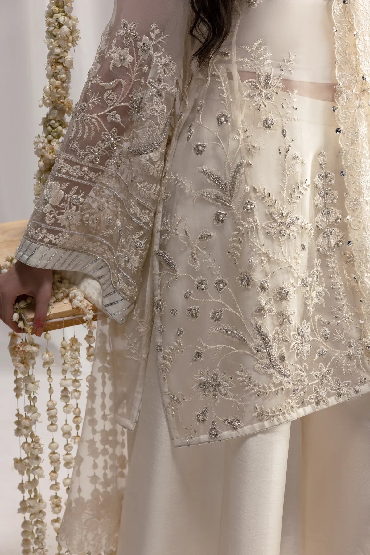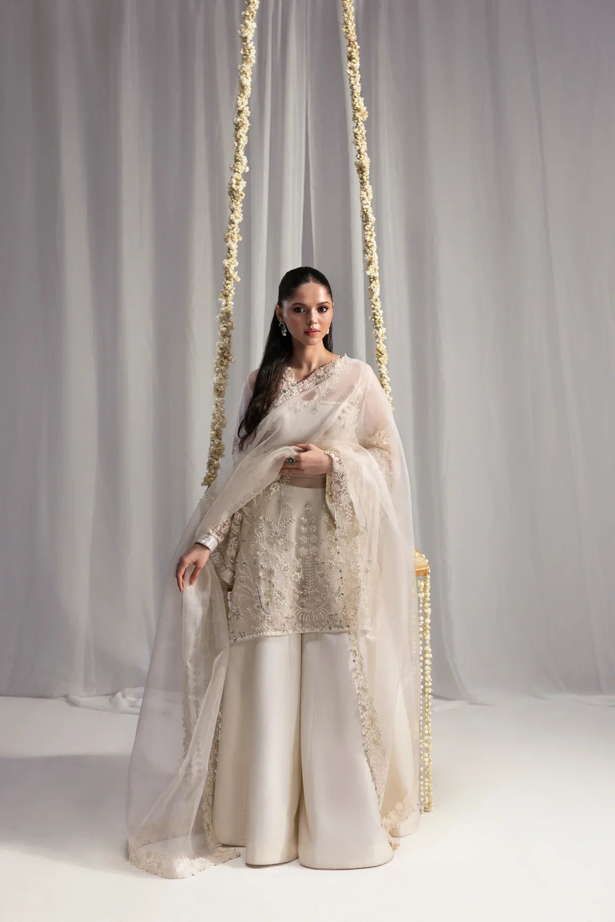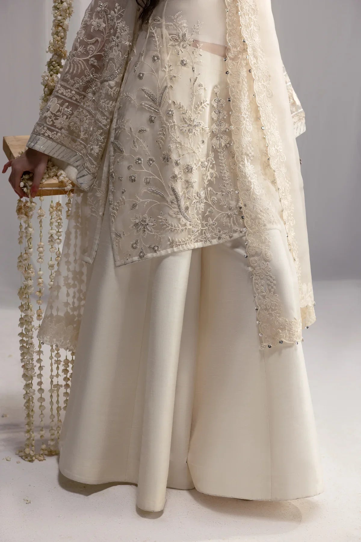 This graceful ivory ensemble features pure organza shirt adorned with exquisite embellishments, showcasing pearls, silver naqshi, gota, sequins, dabka, and bugle beads, all finished with delicate gota work. The sleeve hems are accentuated with a wide gota border, adding a touch of traditional grandeur. Paired with a luxurious raw silk sharara, the outfit exudes timeless sophistication. Completing the look is an organza dupatta, delicately adorned with silver sequins and finished with pearl tassels for a refined elegance. Perfect for weddings, festive celebrations, and formal soirées, this design blends classic artistry with modern charm.