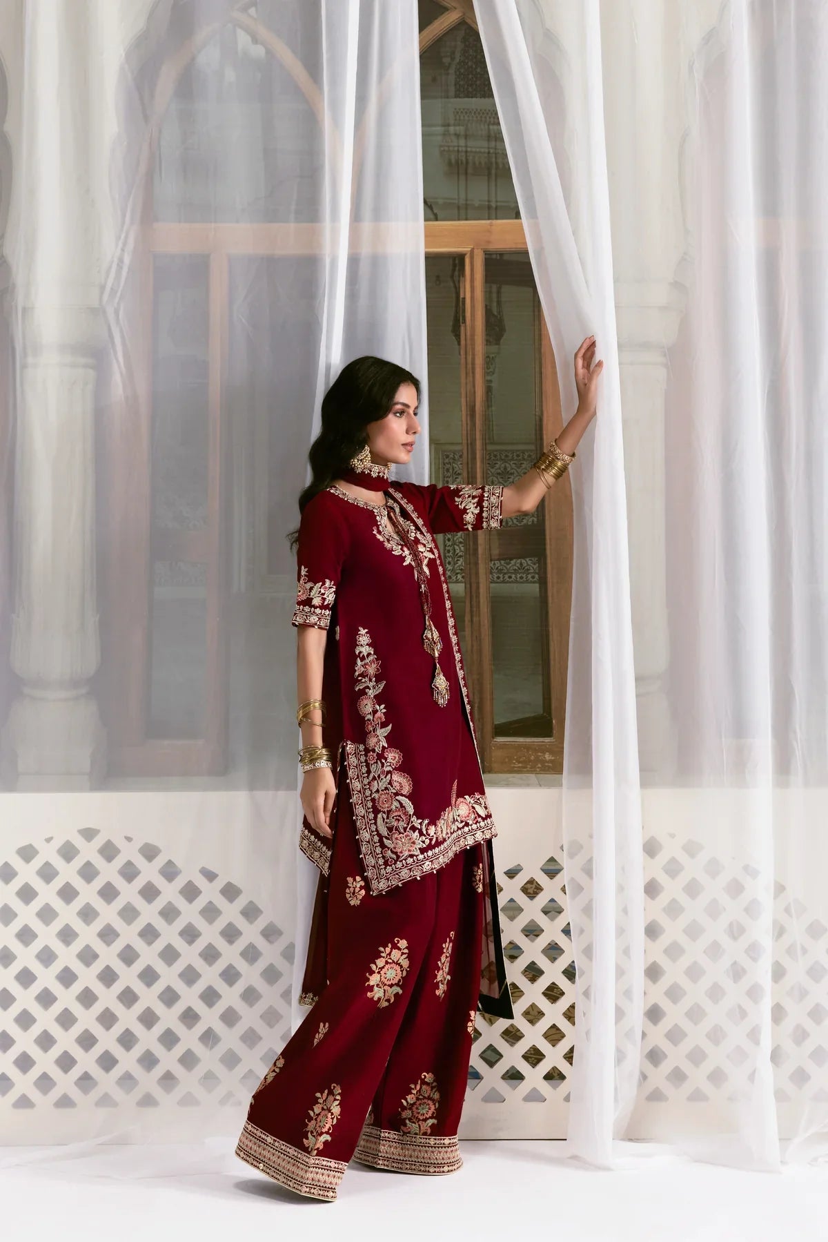 This exquisite maroon formal ensemble features a shirt and wide-leg shalwar, beautifully tailored in luxurious sapphire silk for a rich and lustrous appeal. The outfit is adorned with intricate gold and beige thread embroidery on the neckline, sleeves, hem, and trousers, paired with a graceful georgette chiffon dupatta that adds airy elegance. Lining and facings are crafted from smooth cotton silk, ensuring comfort with a polished finish. Perfect for weddings, festive occasions, and grand celebrations, this design blends traditional craftsmanship with timeless sophistication.