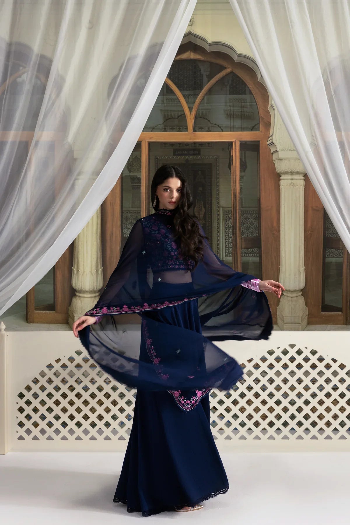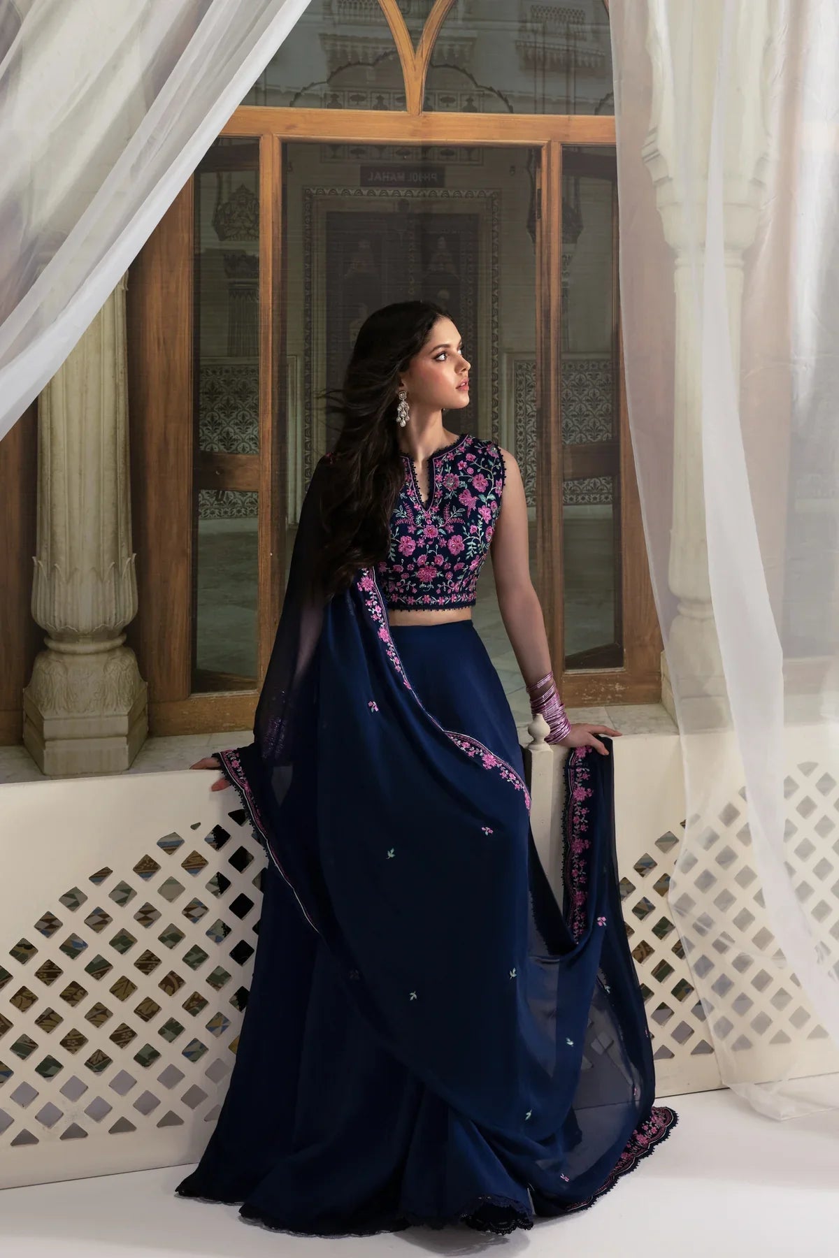 This luxurious formal ensemble features a blouse and lehenga in deep navy sapphire silk, exuding elegance with its rich, lustrous finish. The fluid drape of the fabric enhances the graceful silhouette, making it perfect for grand occasions. A soft georgette chiffon dupatta adds a touch of delicate sophistication, flowing effortlessly with every movement. The outfit is fully lined and faced with smooth cotton silk, ensuring comfort while maintaining a refined structure. Ideal for weddings, festive, and high-profile celebrations, this design blends timeless charm with modern elegance. The deep navy hue lends a regal appeal, making it a statement piece in any formal wardrobe.