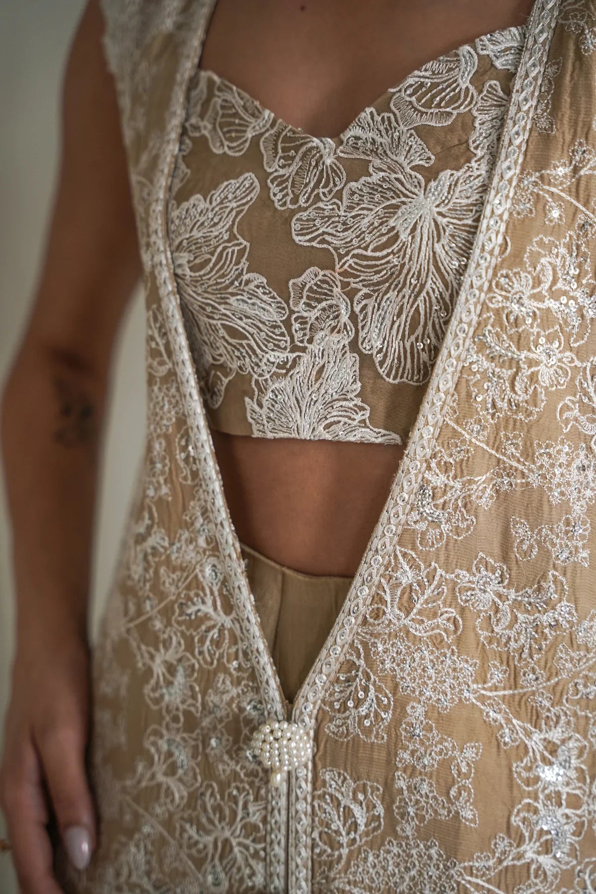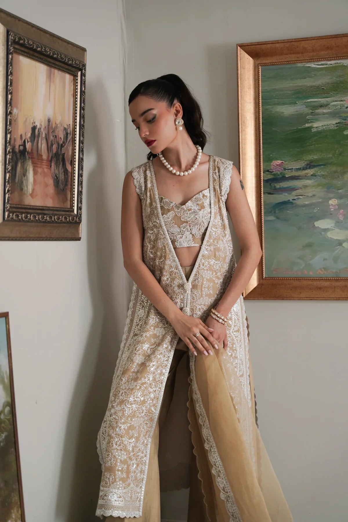 Behold the breathtaking artistry of Fresh Beige open shirt set, where unparalleled opulence meets refined elegance. Crafted in a lustrous off-white hue, this dazzling ensemble is adorned with masterful embroidery, featuring intricate Resham and sequin embellishments that flow gracefully across the entire piece. The floral all-over bustier adds a soft, feminine touch, while plain floor-length culottes introduce a modern, sleek silhouette. The front of the shirt is beautifully accented with pearl adorned buttons, adding a hint of regal charm. Completing the look is a delicate organza dupatta, featuring a four-sided embellished border, perfect for adding an ethereal finishing touch.