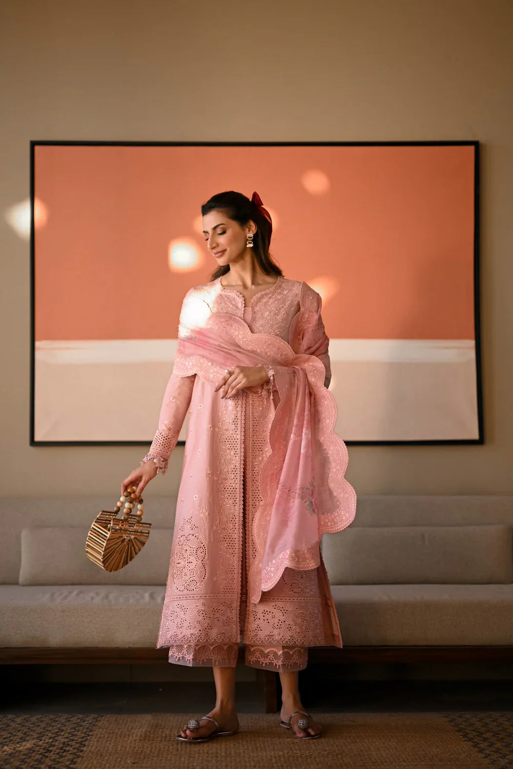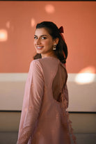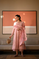 Experience "Pastel Pink": a fusion of grace and sophistication. Featuring a long shirt with delicate embroideries and meticulously crafted borders, inspired by intricate beauty. Adorned with intricately embroidered statement sleeves, the sleek structure offers a modern contrast. Paired with a printed silk dupatta adorned with floral details.