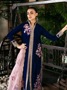 A luxury unstitched three-piece ensemble crafted from sumptuously soft midnight blue velvet. The rich, deep hue of the velvet serves as a perfect canvas for the intricate floral embroidery that gracefully adorns the front open jacket style shirt. Delicate patterns in shades of blush pink, muted gold, and hints of silver embellish the neckline, sleeves, and extended borders, reflecting meticulous craftsmanship. The raw silk trousers are tastefully detailed with matching embroidered motifs at the cuffs, creating a cohesive and polished look. Completing this regal attire is a mesmerizing powder pink organza dupatta, beautifully edged with a thin contrast border.