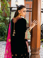 A classic and dramatic unstitched ensemble in bold Black Velvet. The shirt is richly embellished with intricate multicolored thread-work embroidery on the neckline, sleeves, and borders, creating a striking contrast. It is crowned with a dazzling Hot Pink Organza Dupatta, finished with a bold turquoise border and delicate embroidery for an unforgettable statement.