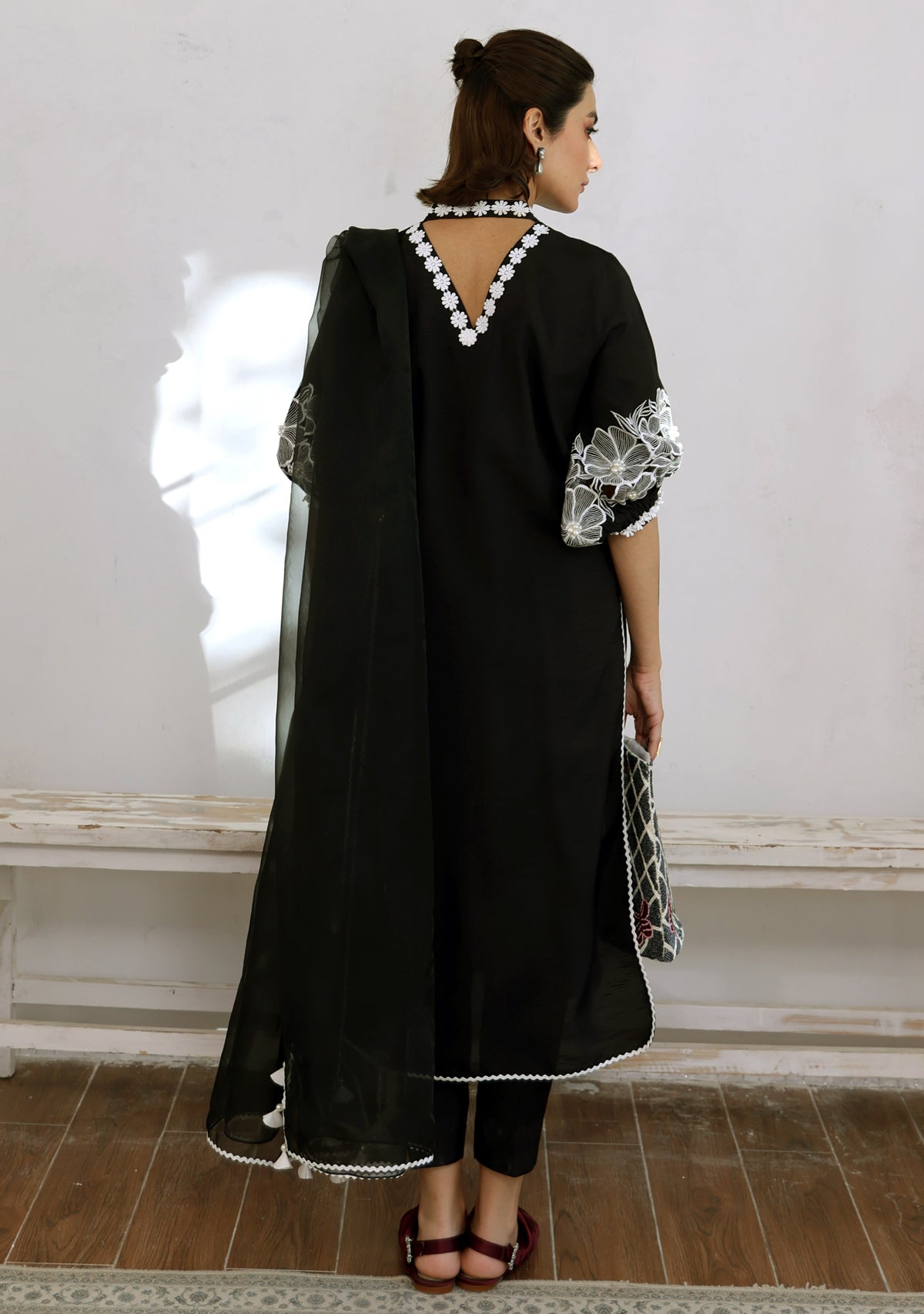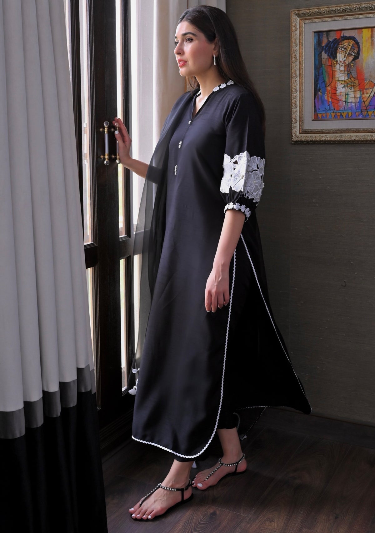 Aida, the black pure bamber raw silk set comes with a straight cut shirt with rounded hem and statement balloon sleeves with contrasting white embroidery and pearl detailing. The set comes with matching cigarette pants and a pure organza dupatta with minimal contrast edgings.