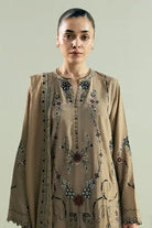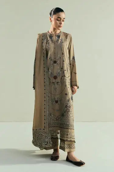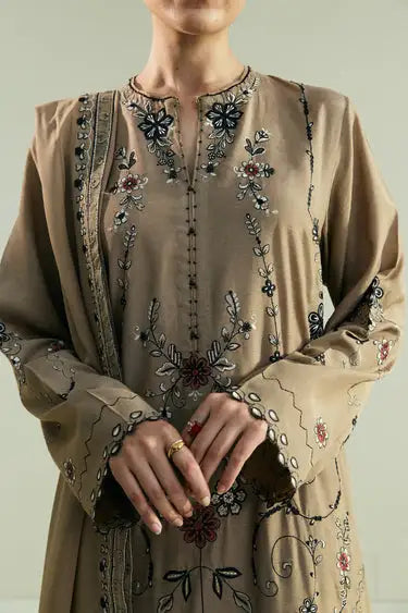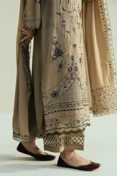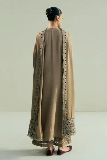 This sand colored loose-fit long shirt is richly embroidered in black and white, with a subtle pop of red adding vibrance to the design. It is paired with cropped straight-fit pants featuring embroidery that complements the shirt’s detailing. A tonal dupatta with delicate embroidery completes the look, creating a refined balance of tradition and modernity.