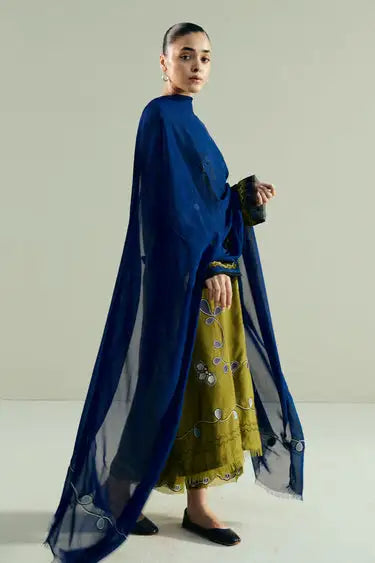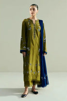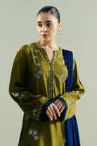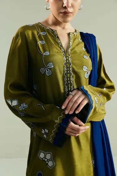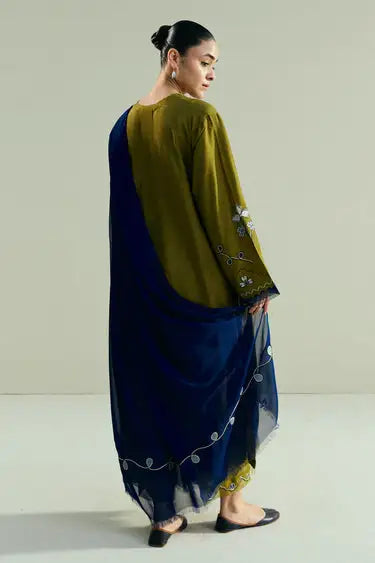 This loose-fit olive green kurta is decorated with intricate embroidery across the front, bringing depth and texture to the design. It is paired with cropped straight-fit pants featuring subtle embroidered details for a balanced finish. A contrasting embroidered dupatta completes the look, adding a striking accent to the overall silhouette.