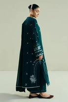 This classic navy blue long kurta is accented with bold cross-stitch embroidery in striking hues of teal and white, bringing a vivid contrast to its clean silhouette. It is paired with tonal culottes that keep the look balanced and refined. A matching dupatta completes the outfit, adding cohesion and understated elegance.