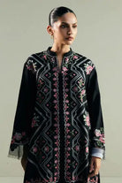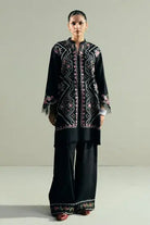 This short black kurta is fully embroidered with vibrant cross-stitch patterns, bringing color and detail to its classic silhouette. It is paired with an embroidered farshi shalwar that adds grace and volume to the look. Together, the pieces create a striking expression of elegance.