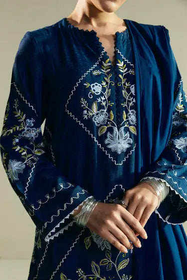 This long mid-night blue loose-fit kurta is decorated with intricate kantha embroidery on the front and sleeves, showcasing fine craftsmanship and detail. It is paired with tonal cropped straight pants featuring delicate embroidery for a subtle finish. A matching dupatta completes the look, tying the pieces together with understated elegance.