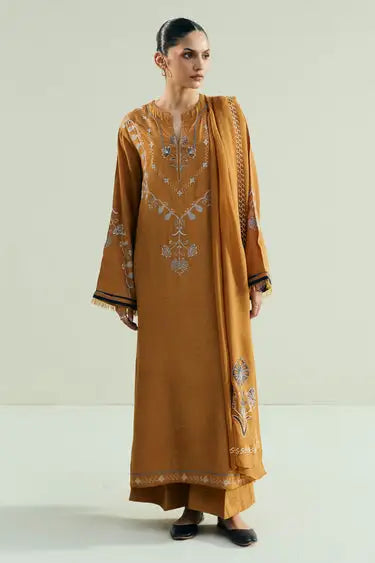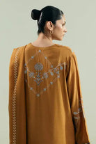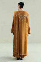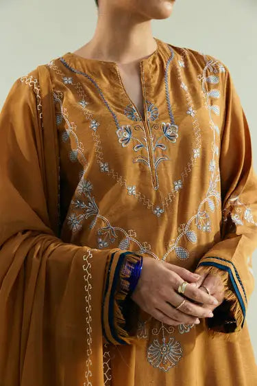 This long mustard loose-fit shirt is styled with minimal embroidery on the front and back, giving it a clean and effortless appeal. It is paired with tonal trousers that keep the silhouette understated. An asymmetrical embroidered dupatta completes the look, adding a touch of contemporary detail.
