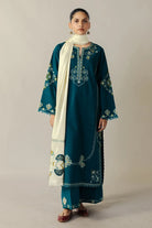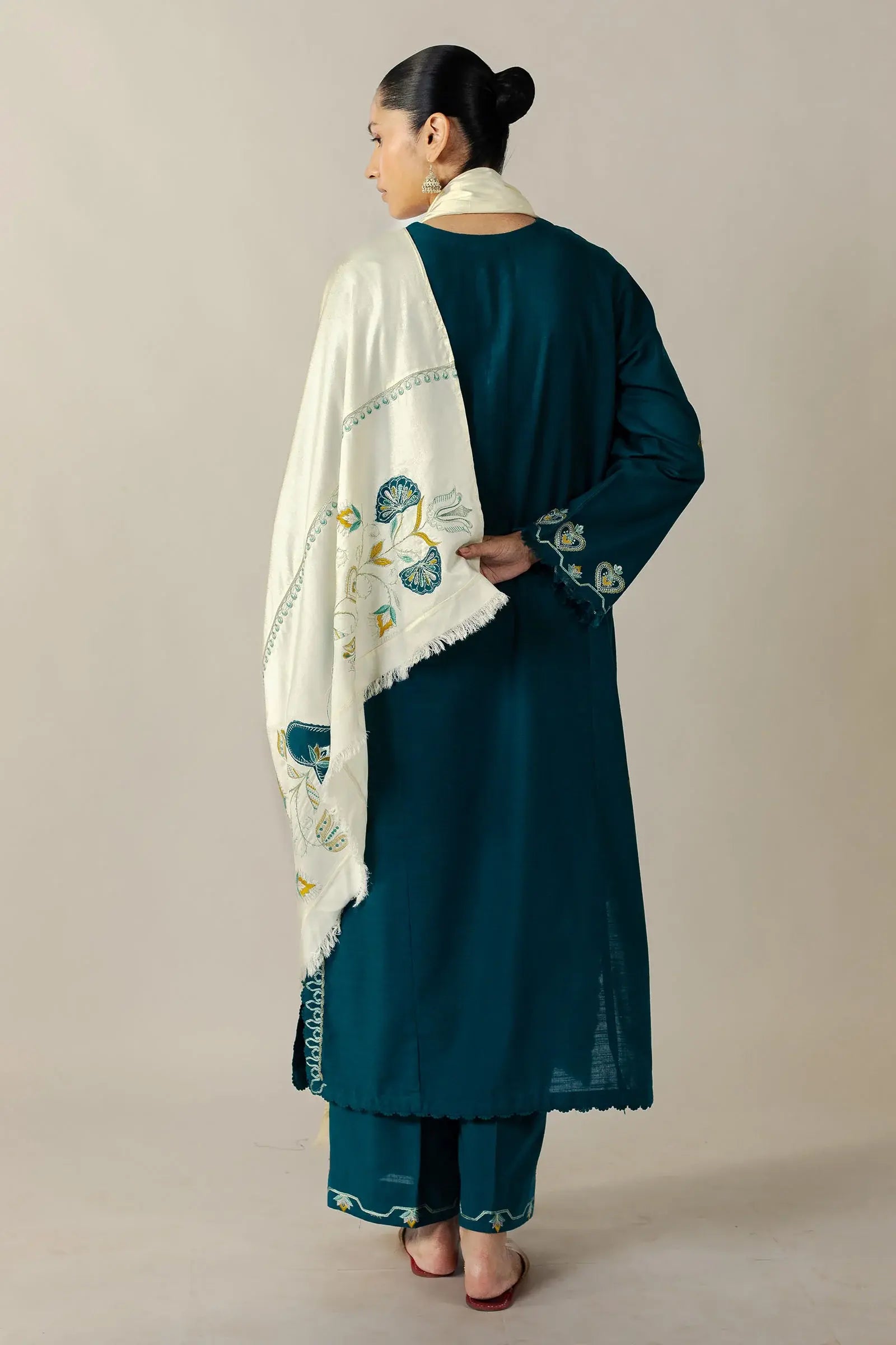 Our classic long shirt adorned with elegant, composed embroidery, paired with cropped wide hem pants featuring coordinated detailing. The ensemble is completed with a shawl showcasing exquisite embroidery on the pallu for a refined, cohesive look.