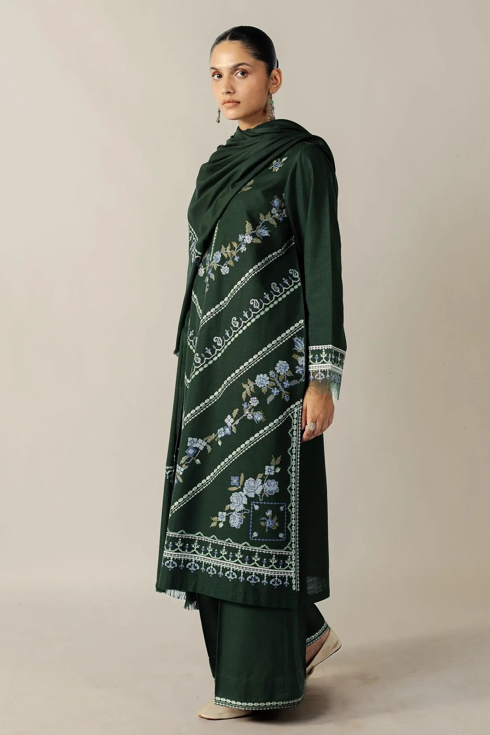 Our loose-fit long kurta features intricate cross-stitch embroidery all over the front, paired with wide-hem pants. A tonal dupatta with delicate embroidery completes the ensemble, striking a perfect balance between tradition and modern elegance.