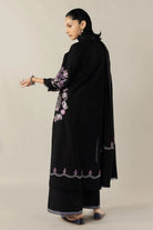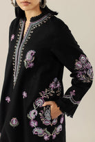 Our long black shirt adorned with embroidery in hues of lilacs on sleeves and front, paired with cropped wide hem pants. Outfit is completed with tonal marina shawl with embroidery details on pallu