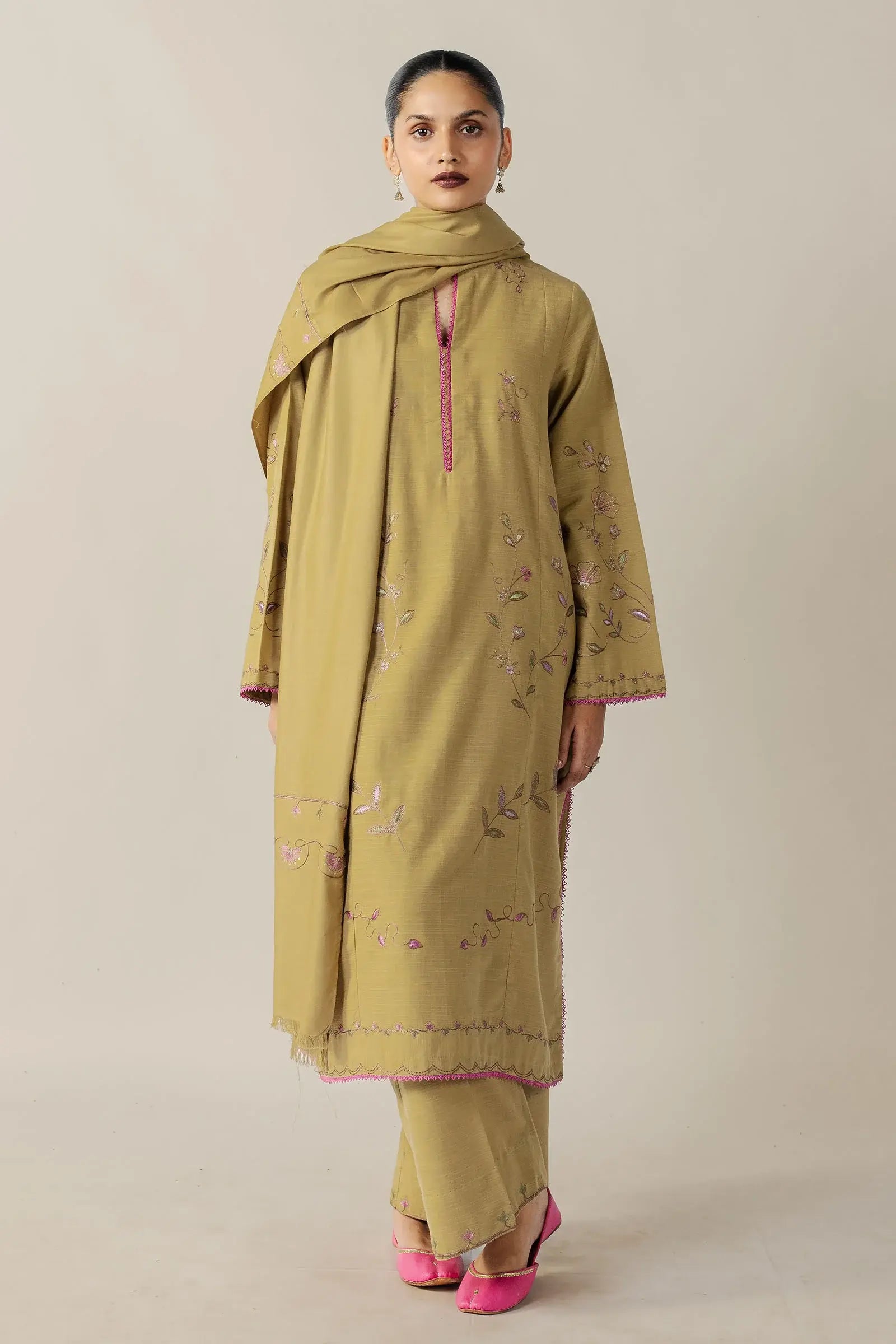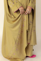 Our all over embroidered shirt is adorned with contemporary, detailed motifs, paired with tonal embroidered cropped wide hem pants. Completed with a matching shawl, this ensemble blends modern style with traditional elegance