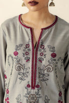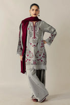 Our classic ensemble features a heavily aari-embroidered short shirt paired with farshi shalwar. Finished with a contrasting Merlot shawl, beautifully detailed with embroidery on both ends.