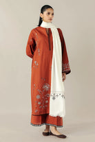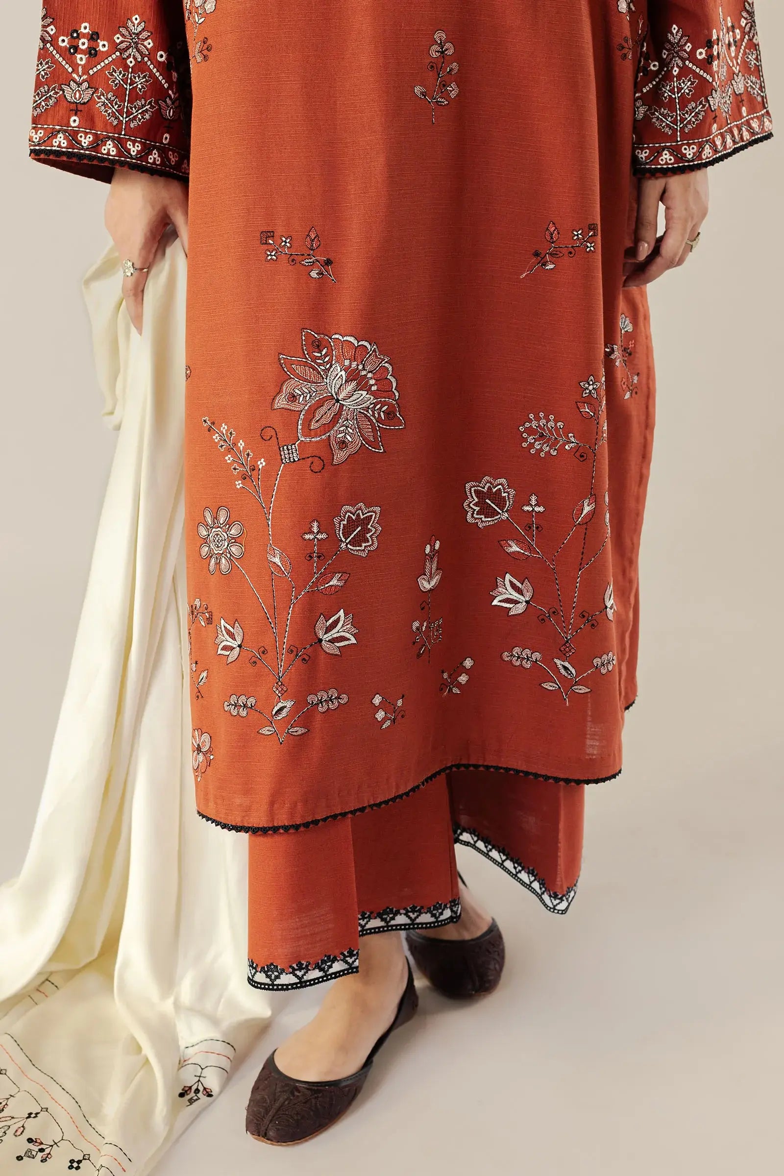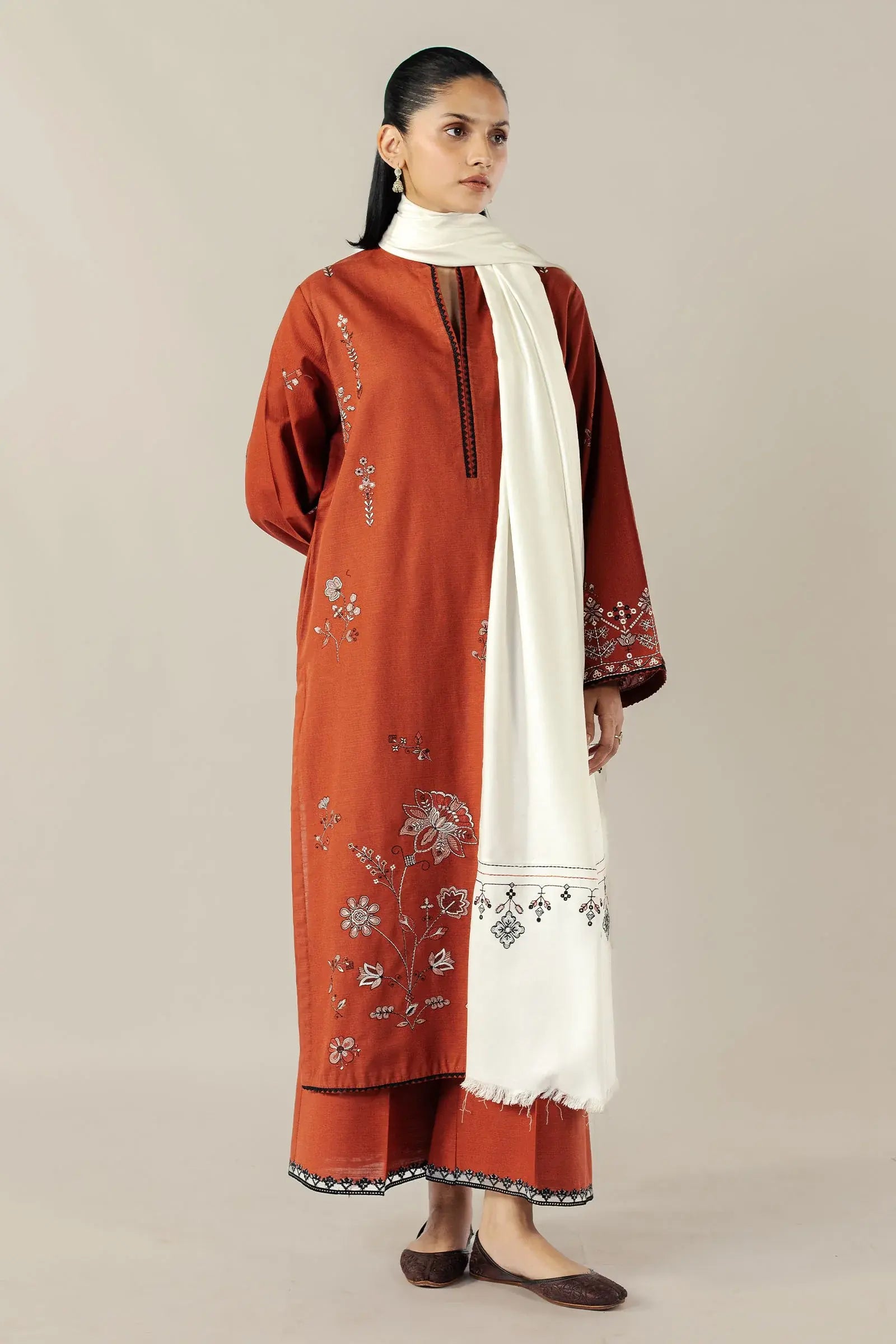 A rust-colored long shirt adorned with black and off-white embroidery, paired with tonal cropped wide hem pants for a refined silhouette. The ensemble is completed with a beautifully embroidered shawl pallu, adding a touch of elegance and tradition.